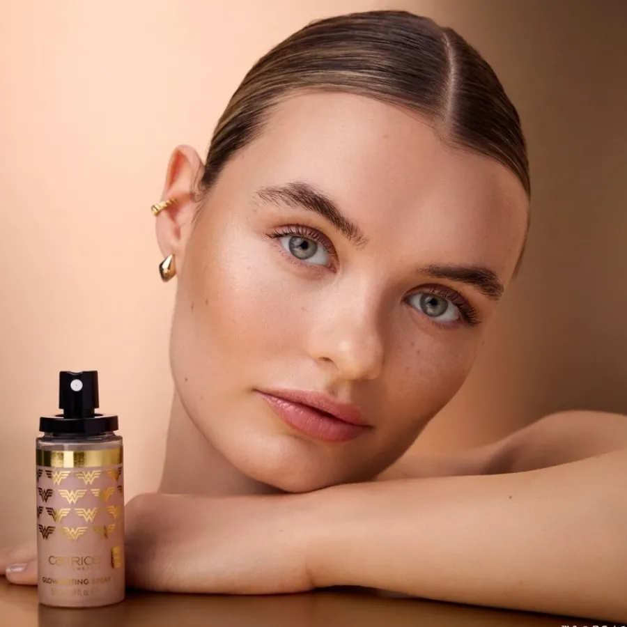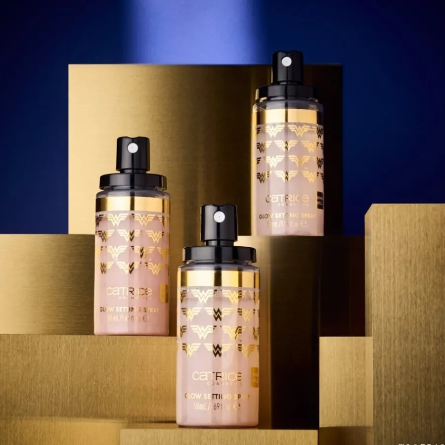 Für einen lang anhaltenden Look mit besonderem Glow: Das Catrice Wonder Woman Glow Setting Spray begeistert gleich auf zweifache Weise. Das Fixierspray verleiht dem Make-up mehr Haltbarkeit, während roségoldene Glanzpartikel den Teint taufrisch und glänzend erscheinen lassen. Mit jedem Sprühstoß legt sich ein sanfter, leichter Schleier auf die Haut, betont die natürliche Ausstrahlung und hebt subtil die eigenen Gesichtszüge hervor. Die Zusammensetzung mit pflegenden Inhaltsstoffen wie Glycerin und Niacinamiden versorgt die Haut zugleich mit Feuchtigkeit.