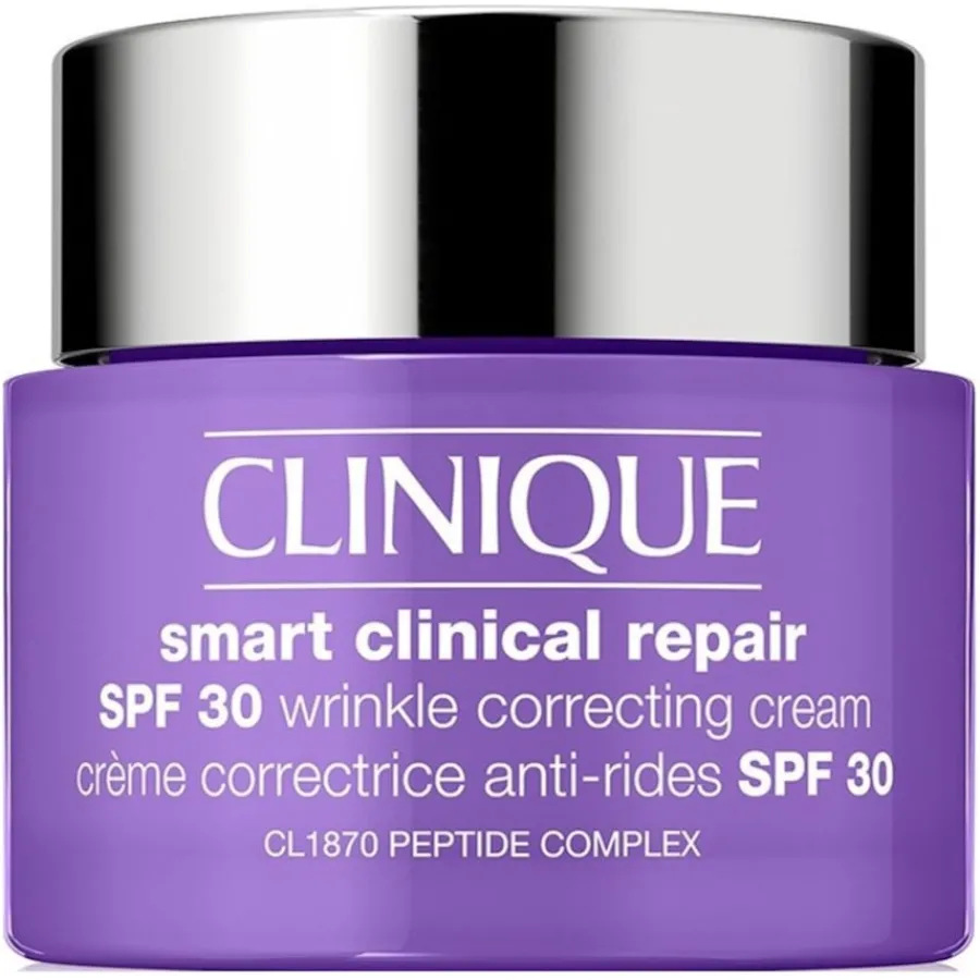 Die Hautpflege, die in dem für den Hersteller charakteristischen lilafarbenen Behälter mit silbernem Deckel daherkommt, ist außerdem in der Lage, die Haut optisch zu verjüngen. Peptide und Provitamin D stärken die Hautbarriere, währenddessen polstert Hyaluronsäure Mimiklinien und Fältchen auf. So wirken diese schon nach wenigen Anwendungen der Clinique Anti-Aging-Pflege Smart Clinique Repair Winkle Correctin Cream SPF30 weniger prominent. Glyzerin hydratisiert für bis zu 12 Stunden zuverlässig die Haut. Die Hautpflege ist frei von synthetischen Duftstoffen und daher auch für empfindliche Hauttypen geeignet. Des Weiteren ist die Formulierung ölfrei, nicht komedogen, nicht fettend und wurde unter dermatologischen Bedingungen auf Allergien getestet.