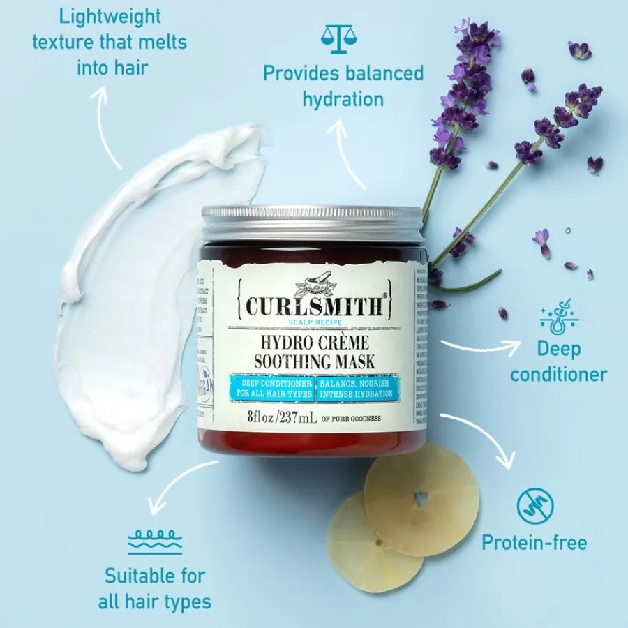 Die innovative Hydro Crème Soothing Mask vereint die Vorteile einer Kur und eines Conditioners. Massieren Sie sie nach dem Waschen sanft in das handtuchtrockene Haar und die Kopfhaut ein. Nach der Einwirkzeit wird die Maske gründlich ausgewaschen. Zurück bleiben Haare, die sich geschmeidig anfühlen und gut kämmen lassen.Angereichert ist die Hydro Crème Soothing Mask mit Hyaluronsäure, die Haare und Kopfhaut nachhaltig mit Nährstoffen und Feuchtigkeit versorgt. Dank ihrer seidig weichen Textur lässt die Maske sich gut einarbeiten und fühlt sich schon beim Einwirken wunderbar sanft an. Sie pflegt die Haare, ohne sie zu beschweren. Die Curlsmith Maske ist für jeden Haartyp geeignet. Freuen Sie sich über Locken voller Glanz und Fülle!