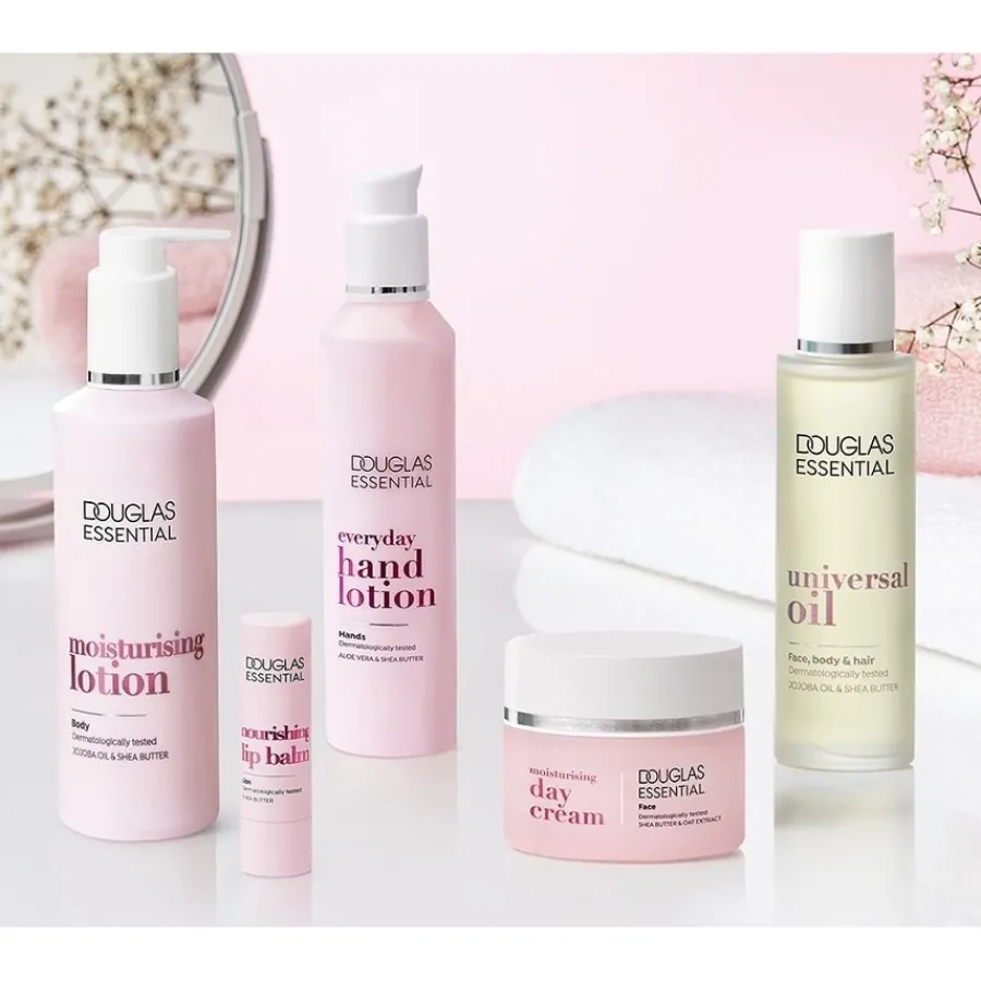 Eine kleine Menge entnehmen und sanft in die Hände einmassieren, bis die Lotion vollständig eingezogen ist.