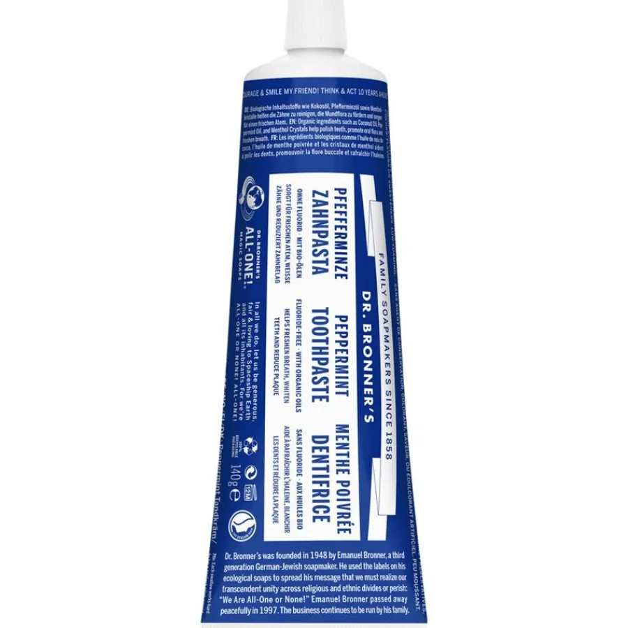Diese Zahnpasta ist nicht nur besser für Sie selbst, sie ist auch besser für unsere Umwelt: Die Inhaltsstoffe der Pfefferminze Zahnpasta von Dr. Bronner’s stammen zu 70 % aus kontrolliert biologischem Anbau. Da sie frei von synthetischen Schaumbildnern ist, schäumt sie weniger als herkömmliche Zahncreme. Sie enthält kein Fluorid und keinen Süßstoff. Die vegane Paste ist frei von Konservierungsmitteln und künstlichen Farb- und Aromastoffen. Tierversuche werden im Hause Bronner konsequent abgelehnt und die Verpackung und die Tube sind zu 100 % recycelbar. Mit der natürlichen Zahnpflege von Dr. Bronner’s leisten Sie jeden Tag Ihren Beitrag, unsere Welt ein kleines bisschen besser zu machen. Ganz dem Credo „We are ALL-ONE or None!“ des Machers folgend.