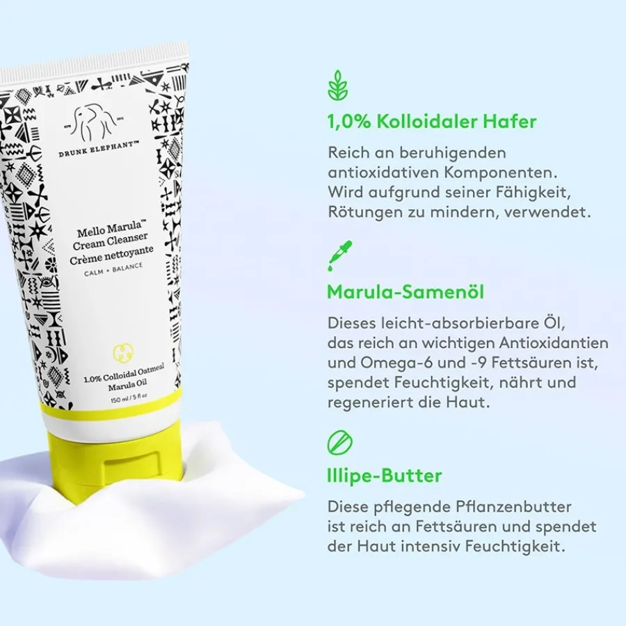 Der Mello Marula Cream Cleanser wurde mit einem hautfreundlichen pH-Wert von 5,0 entwickelt und kommt ohne aggressive Tenside oder SLS aus. Stattdessen sorgt eine pflegende Mischung aus 1,0 % kolloidalem Hafer und Marula-Öl für intensive Feuchtigkeit und Beruhigung der Haut. Milde, aber effektive Tenside reinigen sanft – selbst im empfindlichen Augenbereich. Die Formel lässt sich mühelos und rückstandslos abwaschen und hinterlässt die Haut weich, rein und ausgeglichen – ohne ein unangenehmes Spannungsgefühl.