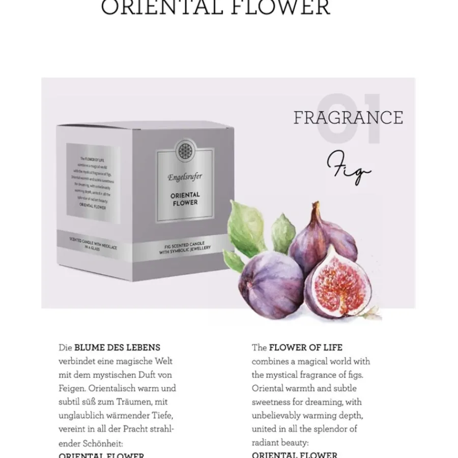 Die Schmuckkerze Oriental Flower mit Kette Lebensblume birgt tief verborgen im Wachs ein kleines Geheimnis, das sich beim Abbrennen der Kerze offenbart. In einer Schutzverpackung findet sich eine glänzende Kette mit dem zeitlos schönen Motiv der Lebensblume. Als Symbol für die unendliche Kraft der Schöpfung fördert die Lebensblume seit Jahrhunderten die Lebensfreude und strahlt Harmonie aus. Wie Duftkerzen hat das mystische Motiv beim Betrachten eine beruhigende und ausgleichende Wirkung.Das filigran gearbeitete Schmuckstück aus Edelstahl hat einen praktischen Karabinerverschluss, der das Anlegen und Ablegen der Kette vereinfacht. Die vegane Schmuckkerze Oriental Flower mit Kette Lebensblume von Engelsrufer besteht zu 100 Prozent aus Sojawachs und ist frei von Schadstoffen. Besonders hochwertig wirkt das seidenmatte Glas in Kombination mit einem edlen Deckel aus echtem Holz.