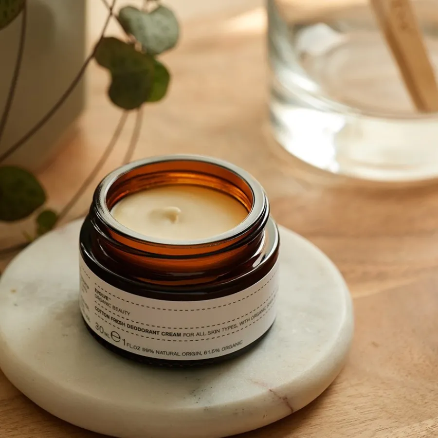 Die Cotton Fresh Deodorant Cream von Evolve Organic Beauty besteht aus natürlichen Inhaltsstoffen, die für zuverlässigen Schutz sorgen, ohne die Haut zu reizen. Die Deocreme ist somit auch ideal zur Hautpflege nach der Rasur geeignet.Sheabutter gilt in Afrika seit langer Zeit als bewährtes Mittel zur Hautpflege. Sie versorgt die Haut mit wichtigen Fettsäuren und wirkt antientzündlich, Kokosöl besitzt wundheilende und antibakterielle Eigenschaften, wodurch geruchsbildende Bakterien an der Vermehrung gehindert werden.Natron neutralisiert Gerüche und absorbiert Feuchtigkeit, während Salbeiöl antimikrobiell, adstringierend und antientzündlich wirkt. Das Deodorant ist leicht mit einem 100 % natürlichen Duft parfümiert. Eine fingerkuppengroße Menge auf die gereinigte Achselhaut auftragen. Bei niedrigen Temperaturen kann es notwendig sein, das Deodorant vor dem Auftragen mit den Fingerkuppen im Tiegel anzuwärmen, um es besser aufnehmen und verteilen zu können.Das Deodorant ist vegan sowie frei von Tierversuchen und Aluminium.
