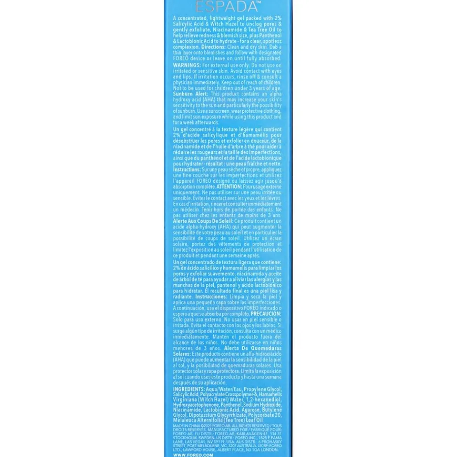 • Eine dünne Schicht des Gels direkt auf die Unreinheiten auftragen und einwirken lassen bis es vollständig eingezogen ist. Die Anwendung mit dem FOREO Gerät ESPADA™ vestärkt die Wirkung.