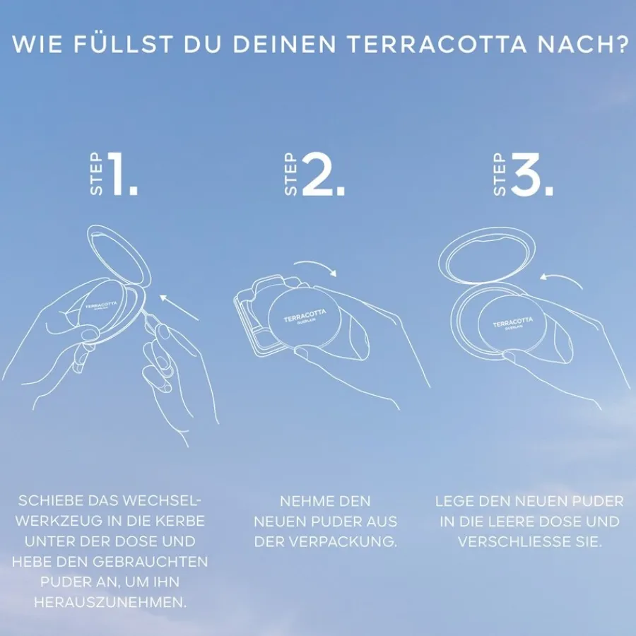 Sie können das Terracotta Light Powder von GUERLAIN großflächig auf Gesicht und Dekolleté oder gezielt auf bestimmten Partien auftragen. Am besten verwenden Sie dafür einen großen Puderpinsel. Das Light Powder kommt direkt auf der Haut oder über Ihrem Make-up gut zur Geltung und harmoniert auch ganz ausgezeichnet mit einem passenden Highlighter.