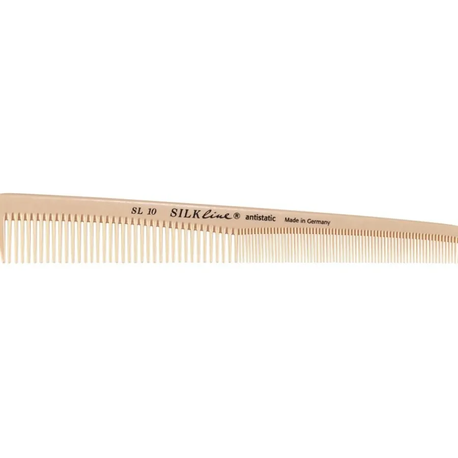 Der Kamm liegt beim Schneiden gut in der Hand und ermöglicht dem Friseur ein schnelles und effizientes Arbeiten. Zum besseren Handling während des Schneidvorgangs ist das Modell mit einem flexibel einstellbaren Griff ausgestattet. Dank seiner antistatischen Eigenschaften ist das Modell für den Einsatz im Friseurladen perfekt geeignet. Das Besondere an den Schneidekämmen des Labels sind die feinen, sanft abgerundeten Zinken. Sie ermöglichen einerseits ein flexibles Schneiden der Haare, sind andererseits jedoch sanft zu Haaren und Kopfhaut. Die Schneidekämme von Hercules Sägemann tragen am Griff den Namen der Produktlinie Silk Line sowie den Namen des jeweiligen Produkts. Bestellen Sie den Schneidekamm Modell SL10 und weitere Produkte des Labels im Shop Parfumdreams. Das Label gehört zur New-York Hamburger Gummi-Waaren Compagnie, einem traditionellen Hersteller von Produkten für den Friseurbedarf. Neben Schneidekämmen sowie Haare-Bürsten & Kämme stellt das Unternehmen ebenfalls Scheren und Verbrauchsmaterial her. Friseure in der ganzen Welt schätzen die hochwertigen Produkte.