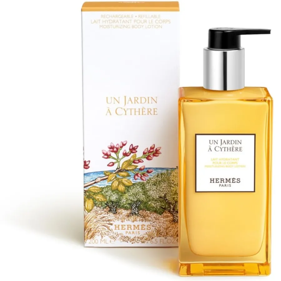 Wenn Sie Ihren Körper mit der Moisturizing Body Lotion eincremen, erfüllt Sie pures Wohlbehagen. Die seidige Creme verschmilzt nahezu mit der Haut und hinterlässt ein angenehmes Gefühl. Auch zieht sie schnell ein, ohne einen klebrigen Eindruck zu hinterlassen. Die Haut wird genährt, beruhigt und nachhaltig mit Feuchtigkeit versorgt, fühlt sich weich, zart und geschmeidig an.Die Hermès Bodylotion ist angereichert mit dem edlen Duft Un Jardin à Cythère. Er präsentiert sich wie ein bunter Garten voller Überraschungen. Der holzige Zitrusduft zeigt sich sommerlich und sonnig, mit Gräsern und mediterranen Akzenten. Nach dem Eincremen bleibt der Duft lang anhaltend, aber dezent haften und wird zum verführerischen Begleiter für den ganzen Tag.