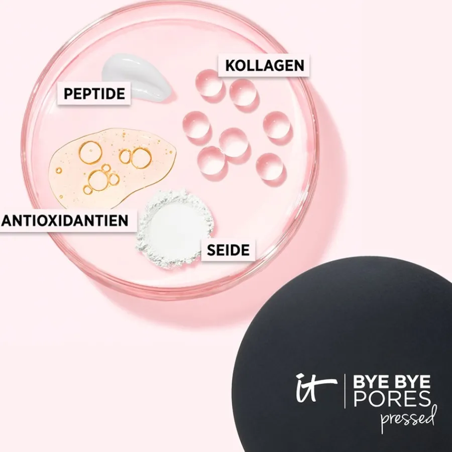 Der it Cosmetics Bye Bye Pores Pressed Kompaktpuder enthält einen wirkungsvollen Anti-Aging-Komplex aus Peptiden, hydrolisiertem Kollagen, Antioxidantien und echten Seidenpartikeln, die die Haut verjüngen, verwöhnen, aufpolstern und pflegen. Der preisgekrönte Puder ist eines der meist verkauften Produkte des Make-up-Herstellers und deckt Unreinheiten wirkungsvoll ab – für ein jugendliches, ebenmäßiges und strahlendes Hautbild.