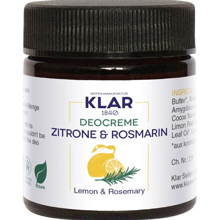 Die Deocreme Zitrone & Rosmarin aus dem Hause Klar Seifen basiert auf Sheabutter, Mandelöl und Kokosöl. Diese Inhaltsstoffe pflegen die Haut, während Natron und Zink dafür sorgen, dass die Schweißproduktion reduziert und Schweißgeruch vermindert wird. Das ätherische Rosmarinöl ist bekannt für seine desinfizierende Wirkung. So wird ein zuverlässiger Schutz erreicht. Sogar nach der Rasur können Sie die Deocreme verwenden.Die Hautpflege aus der Produktkategorie Feste Deocreme & Körperbutter von Klar Seifen kommt ohne Aluminiumsalze und Alkohol aus. Auch auf Palmöl wurde verzichtet.Eine erbsengroße Menge Deocreme Zitrone & Rosmarin, die Sie unter den vorab gereinigten Achseln verreiben, reicht aus und schützt Sie den ganzen Tag über. Lagern Sie das Produkt kühl.