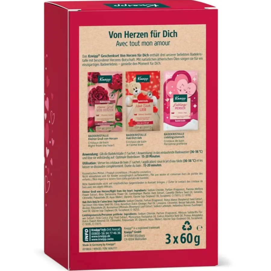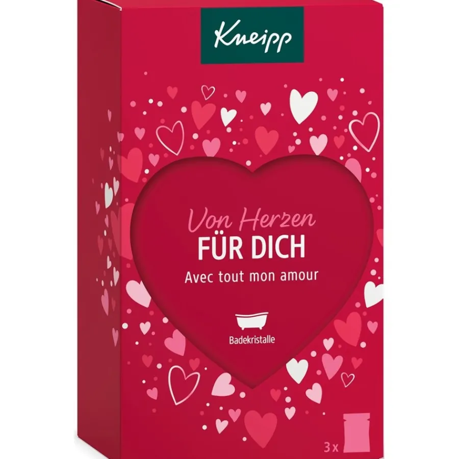 Die Badekristalle im Von Herzen für Dich Set von Kneipp sind nicht nur eine sanfte Hautpflege, sondern auch eine liebevolle Herzens-Botschaft für einen besonderen Menschen. Sie können sich damit aber auch ganz einfach selbst beschenken: für erholsame Auszeiten fernab von Stress und Hektik! Die wunderschön gestaltete Verpackung verbirgt in ihrem Inneren drei verschiedene Sachets mit hochwertigen Kneipp Badekristallen: Sie erhalten einmal „Hab Dich lieb“, einmal „Kleiner Gruß von Herzen“ und einmal „Lieblingsmensch“. Jedes Sachet hat einen Inhalt von 60 Gramm und reicht für ein wohltuendes Vollbad aus.
