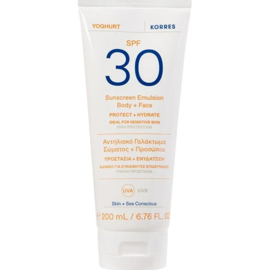 Die einzigartige Yoghurt Sonnenschutz-Emulsion für Körper und Gesicht SPF30 von Korres ist Sonnenschutz und Sonnenpflege zugleich. Für den optimalen Schutz gegen schädliche Auswirkungen der UV- und IR-Strahlung ist die Sonnencreme mit echtem Speisejoghurt aus Griechenland angereichert. Die Haut wird intensiv gepflegt, mit Feuchtigkeit versorgt und fühlt sich geschmeidig und glatt an. Hochwertige Wirkstoffe wie Panthenol und Vitamin E stärken die Feuchtigkeitsbarriere der Haut und sorgen gleichzeitig für einen gesünder aussehenden Teint. Die Sonnenschutz-Emulsion ist für Damen und Herren mit einem normalen Hauttyp geeignet.