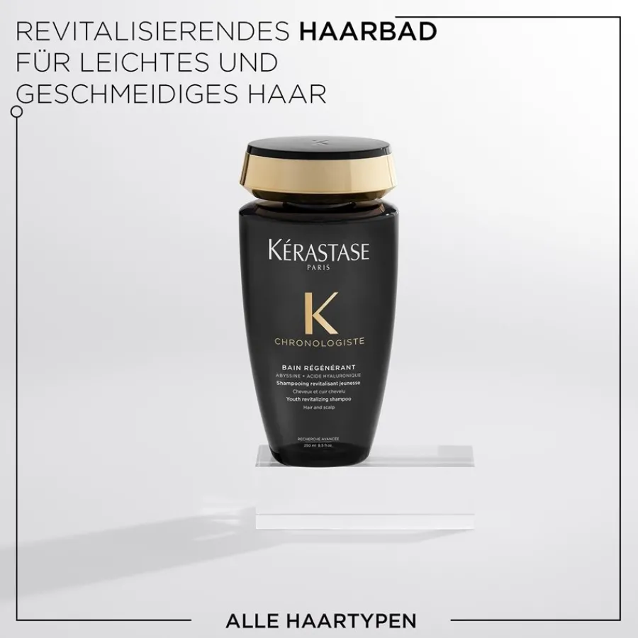 Das Chronologiste Bain Régénérant Shampoo von Kérastase pflegt und reinigt die Haare intensiv. Es hydratisiert die Haare, stärkt die Haarfaser und bietet optimalen Schutz vor schädlichen Einflüssen. Anzeichen der Alterung von Haaren und Kopfhaut bekämpft es effektiv. Die Haare werden geglättet und ihre Elastizität wird verbessert. Geeignet ist die Haarpflege für alle Haartypen. Tragen Sie das Shampoo auf die nassen Haare auf, lassen Sie es aufschäumen und spülen Sie es sorgfältig aus. Genießen Sie weiches, vitales Haar mit natürlich schönem Glanz!