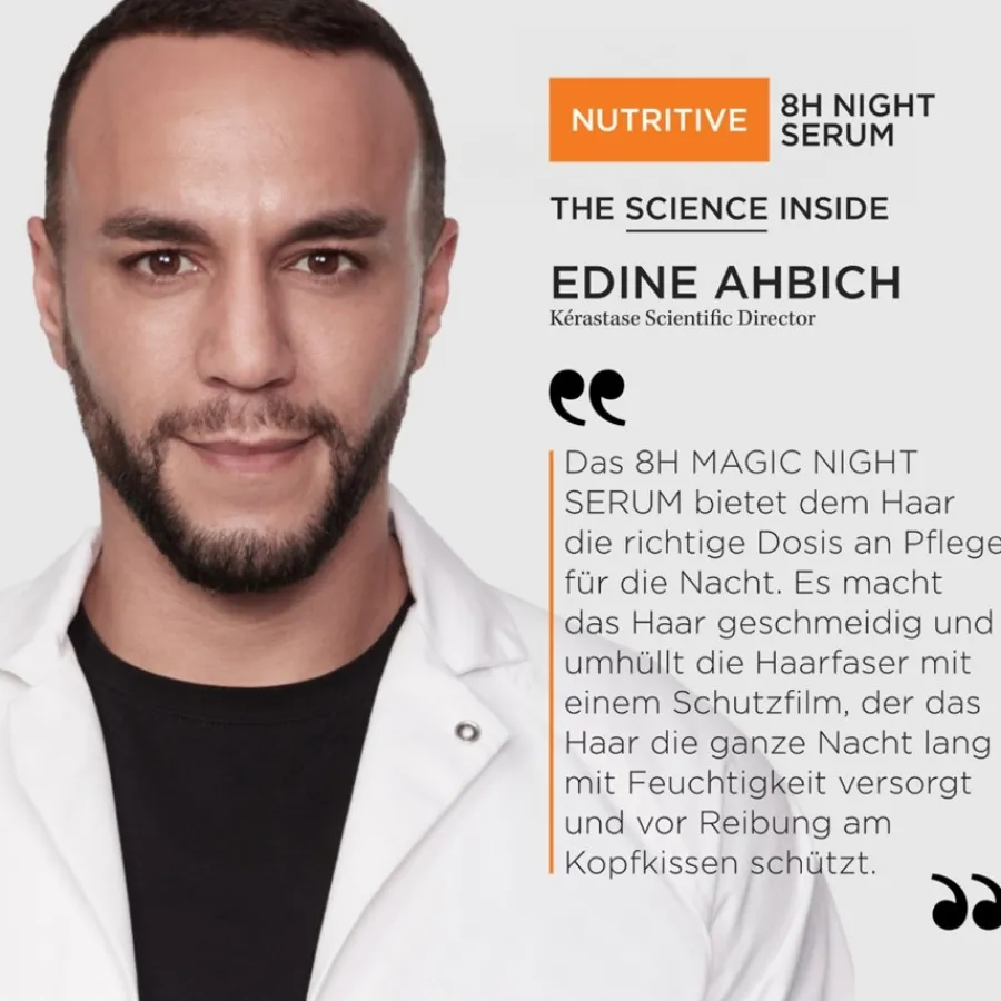 Das Nutritive 8H Magic Night Serum von Kérastase spendet den Haaren über Nacht bis in die Tiefe Feuchtigkeit und revitalisiert sie. Es baut die Haarfaser wieder auf, entwirrt sie und regeneriert sie. Seine leichte Textur zieht über Nacht ein und sorgt am Morgen für ein geschmeidiges, schwereloses Haargefühl. Es ist die ideale Wahl für trockene und strapazierte Haare. Geben Sie 1 bis 2 Pumpstöße des Serums in die Handflächen und arbeiten es gleichmäßig in die Längen und Spitzen ein. Lassen Sie es über Nacht einwirken und erleben Sie am Morgen seidiges, geschmeidiges Haar mit gesundem Glanz!