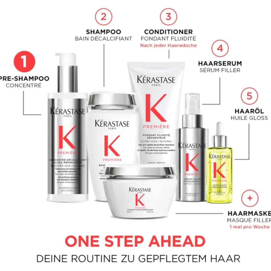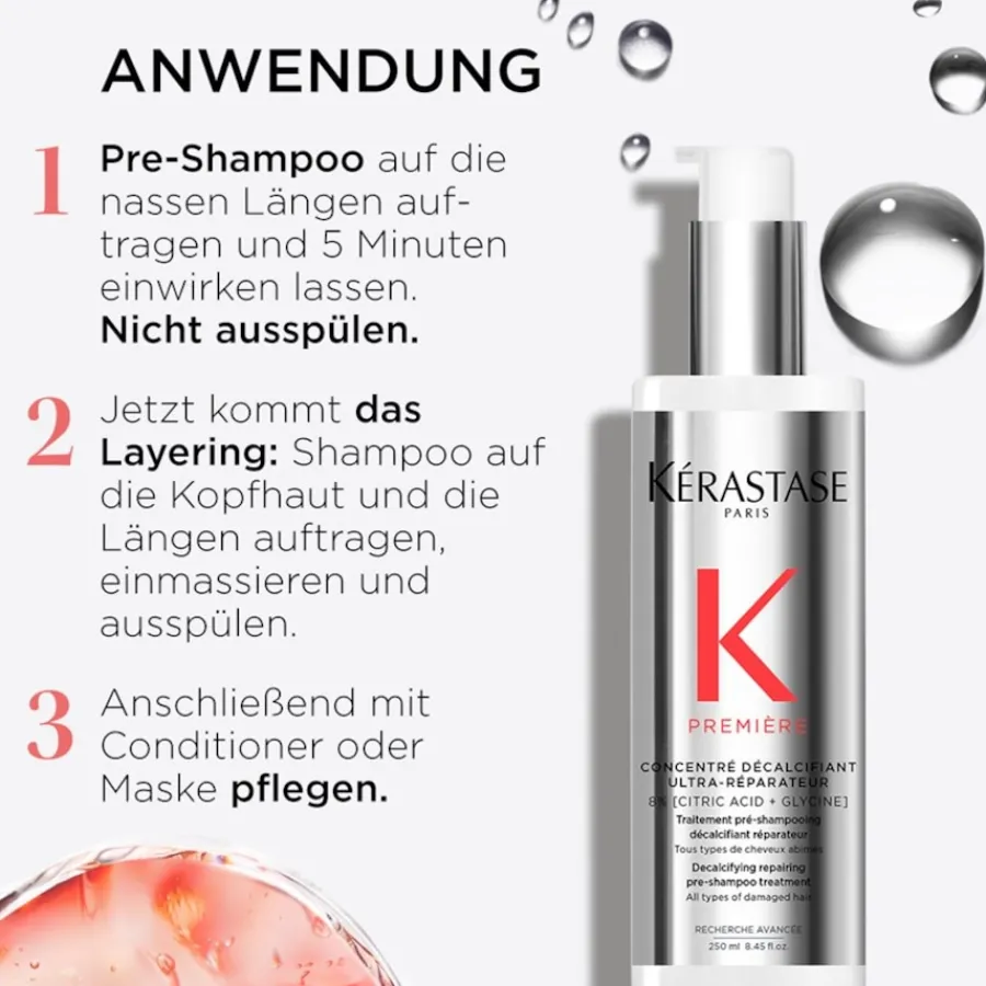 Das Première Pre-Shampoo Concentré Décalcifiant von Kérastase befreit die Haare von überschüssigem Kalzium und beugt dadurch Haarbruch und Haarschäden vor. Es repariert die Haare tiefenwirksam, indem es die unterbrochenen Brücken der Keratinketten in der Haarfaser wieder schließt. Zudem stärkt es die Haare und verbessert ihre Widerstandskraft. Seine Formel eignet sich für jede Form von geschädigten, strapazierten und geschwächten Haaren. Tragen Sie die Vorbehandlung vor dem Haarewaschen auf die feuchten Haarlängen auf und massieren sie sorgfältig ein. Lassen Sie das Konzentrat 5 Minuten lang einwirken, spülen es nicht aus und waschen danach Ihr Haar wie gewohnt. Erleben Sie lebendiges, schwungvolles und glänzendes Haar!