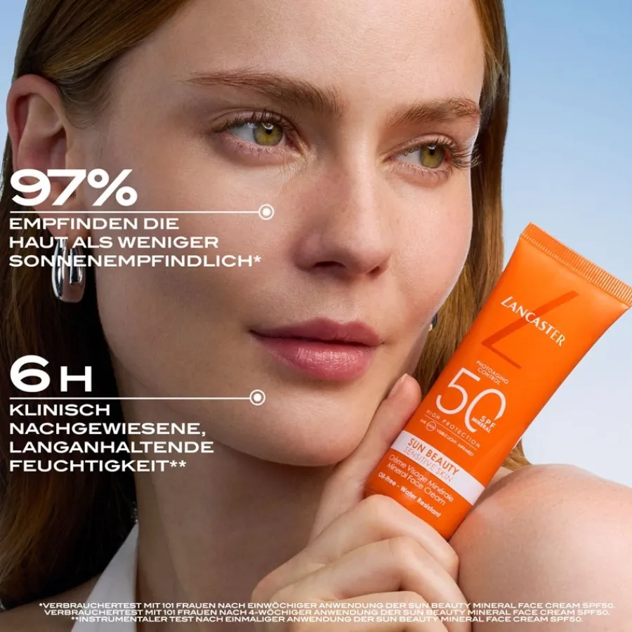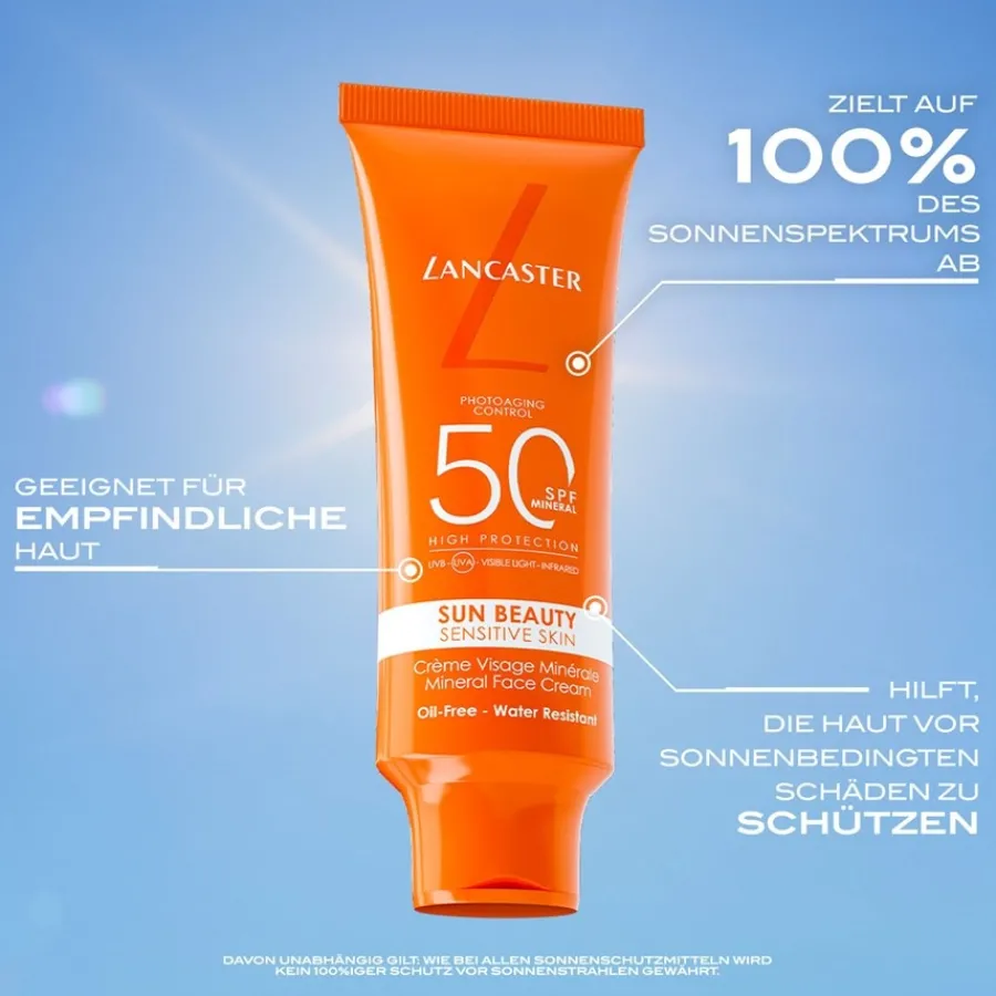 Da die Lancaster Sun Beauty Mineral Face Cream SPF50 mineralische Filter verwendet, eignet sie sich sehr gut zur Anwendung auf schnell reizbarer und empfindlicher Haut. Ebenfalls enthalten ist der Sunsicalm-Komplex des Herstellers, der die Haut während der Tragezeit der Sonnencreme fortlaufend beruhigt und damit das Risiko für Rötungen reduziert. Trotz der mineralischen Filter verspricht der Hersteller kein störendes Weißeln der Creme, aufgrund ihrer leichten Textur käme sie sogar als Make-up-Unterlage im Sommer infrage. Auf Öle wurde in der Formulierung verzichtet, trotzdem ist die Creme wasserfest. Nach mehrmaligem Kontakt mit Wasser oder bei starkem Schwitzen sollte sie aber gegebenenfalls neu aufgetragen werden.