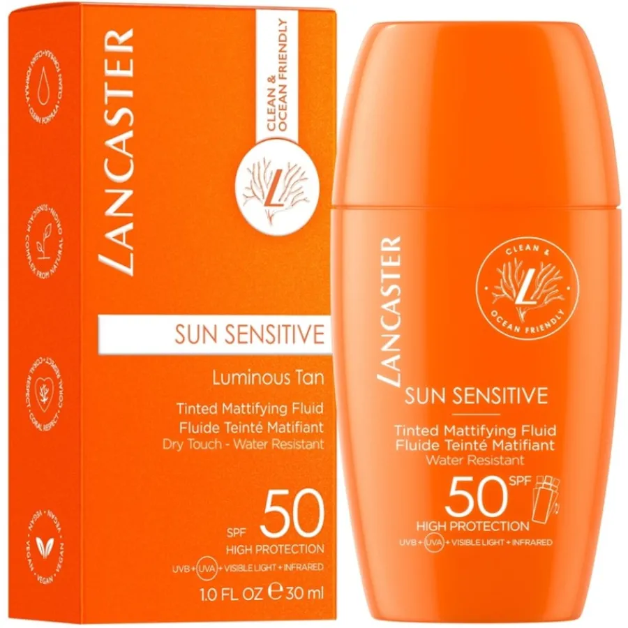 Das leichte Tinted Mattifying Fluid SPF50 bietet einen Breitbandschutz vor UV-B- und UV-A-Strahlen, sichtbarem Licht und Infrarotstrahlen. Es schützt dadurch vor sonnenbedingten Schäden und stärkt die natürliche Widerstandsfähigkeit der Haut. Durch die Inhaltsstoffe des Sun Sensitive Produkts werden Rötungen und Trockenheit gemindert, während die Haut durch den Tan-Activator-Komplex stimuliert wird, eine strahlende Bräune zu entwickeln. Die cleane und meeresfreundliche Formel des Tinted Mattifying Fluid SPF50 aus der Sun Sensitive Linie von Lancaster ist leicht aufzutragen und hinterlässt ein angenehmes Gefühl auf der Haut. Das nicht komedogene Sonnenschutzfluid hinterlässt ein Finish mit Weichzeichnereffekt und trockener Haptik, um einen ebenmäßigen Teint zu erzielen – die perfekte Wahl für Menschen mit empfindlicher Haut, die einen zuverlässigen und hautpflegenden Sonnenschutz suchen.