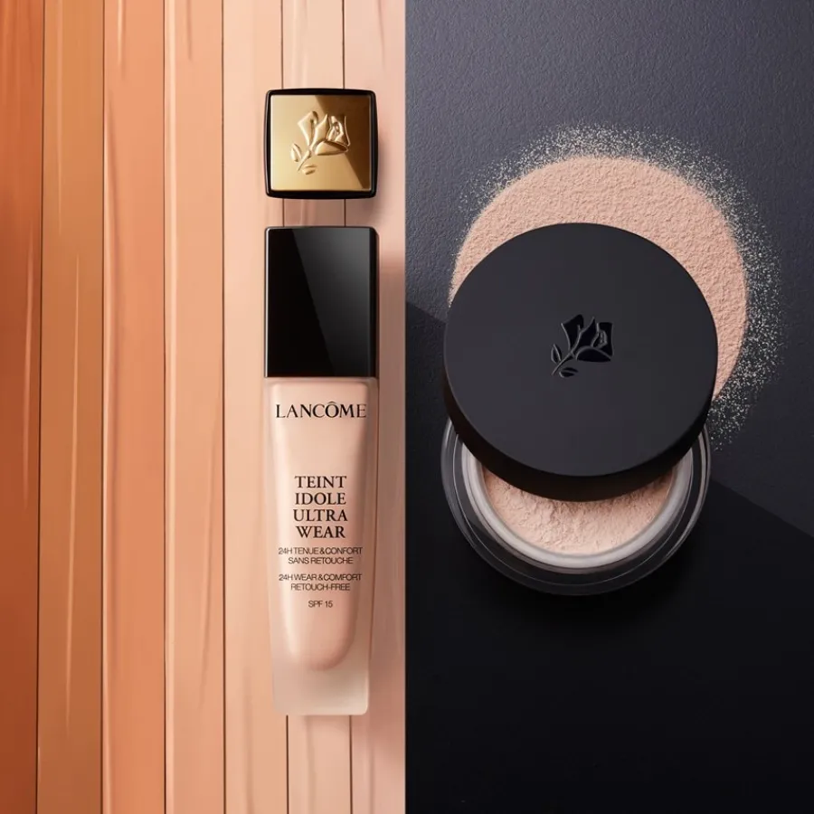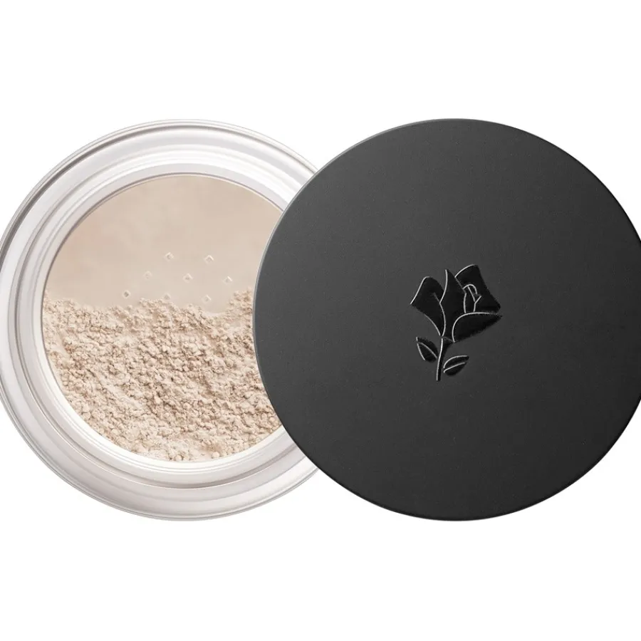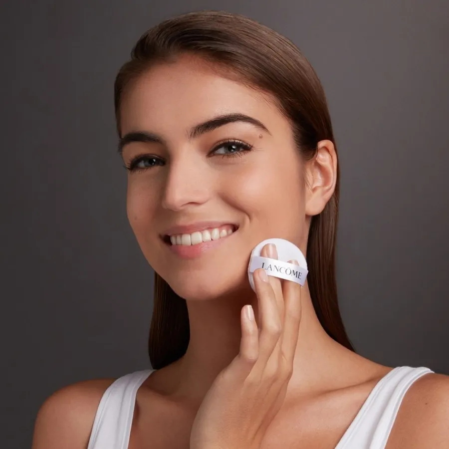Mit einem großen Pinsel wird Anti-Glanz-Puder aufgetragen, und zwar nicht nur im Gesicht, sondern auch auf Hals und Dekolleté, um die Haut zu mattieren.
