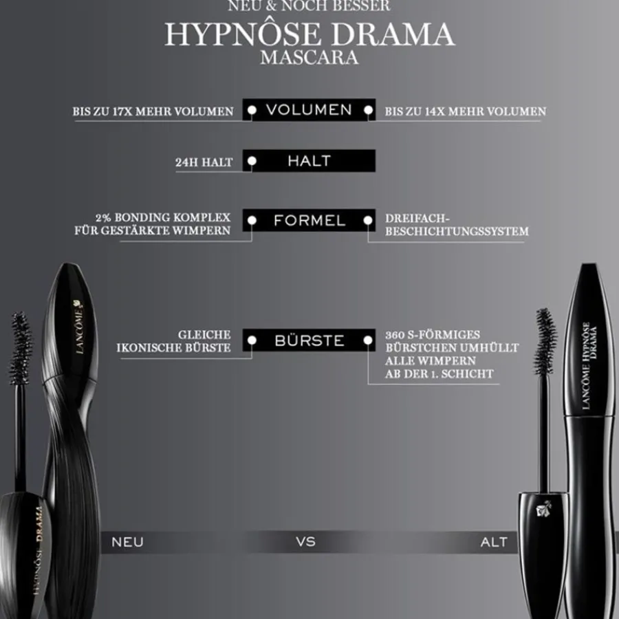 Zusätzlich zu dem voluminisierenden Bürstchen überzeugt Lancômes Hypnôse Drama Volumenmascara auch mit einer pflegenden Formel, die unter augenärztlicher Aufsicht getestet wurde und sowohl für empfindliche Augen als auch für Kontaktlinsenträger geeignet ist. In dieser Pflegeformel ist ein zweiprozentiger Bonding-Komplex enthalten, der die Wimpern umhüllt und ihnen so ein gestärktes Gefühl verleiht. Die ebenfalls enthaltenen Onyx-Pigmente zaubern eine tiefschwarze Intensität für noch mehr Drama.