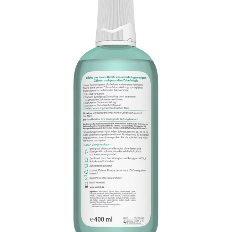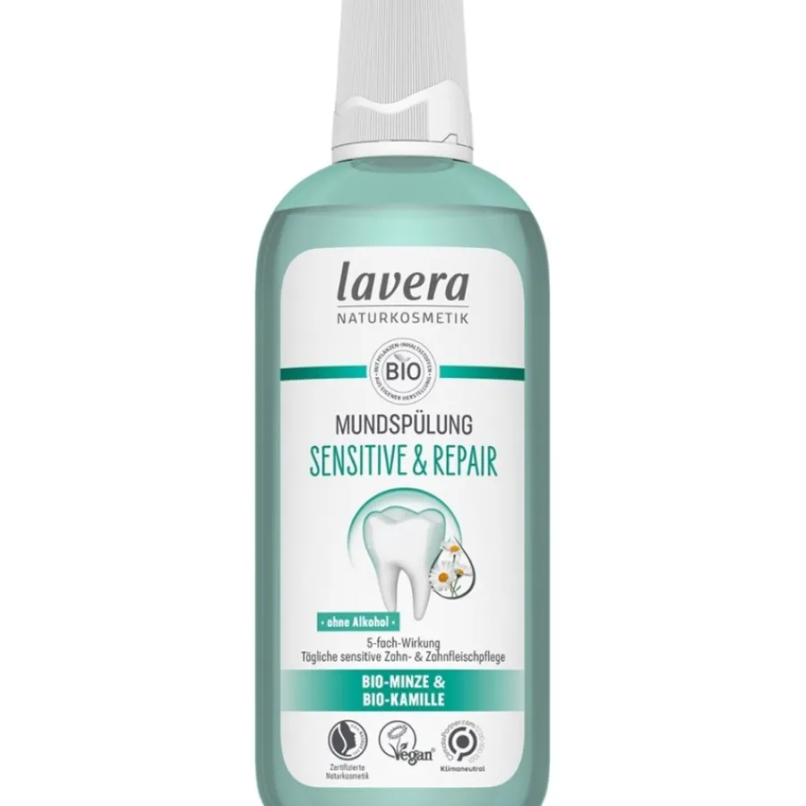Die Sensitive & Repair Mundspülung von Lavera ergänzt die tägliche Mundhygiene. Sie schützt vor Karies, Zahnsteinbildung und Zahnfleischproblemen und entfernt Zahnbelag auch in den Zahnzwischenräumen, die schwer zugänglich sind. Außerdem sorgt sie mit mentholhaltiger Bio-Minze für frischen Atem. Mit ihrer sensitiven Rezeptur wirkt die Zahnpflege also fünffach und ist gut für den Zahnschmelz.Die nach NATRUE Naturkosmetikstandard zertifizierte Rezeptur ist biologisch abbaubar und frei von Mikroplastik, künstlichen Duft- und Farbstoffen sowie Konservierungsmitteln. Die Flasche besteht aus Recyclingmaterial.Verwenden Sie die Sensitive & Repair Mundspülung von Lavera nach dem Zähneputzen und spülen Sie 30 Sekunden lang mit der Zahnpflege. Um die volle Wirkung zu erreichen, sollte nach Ausspucken nicht mit Wasser nachgespült werden. Die Mundspülung ist nur für Erwachsene geeignet.