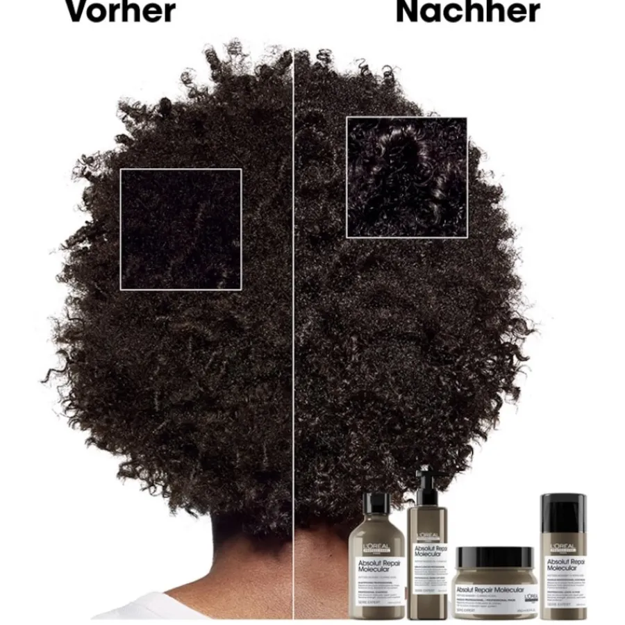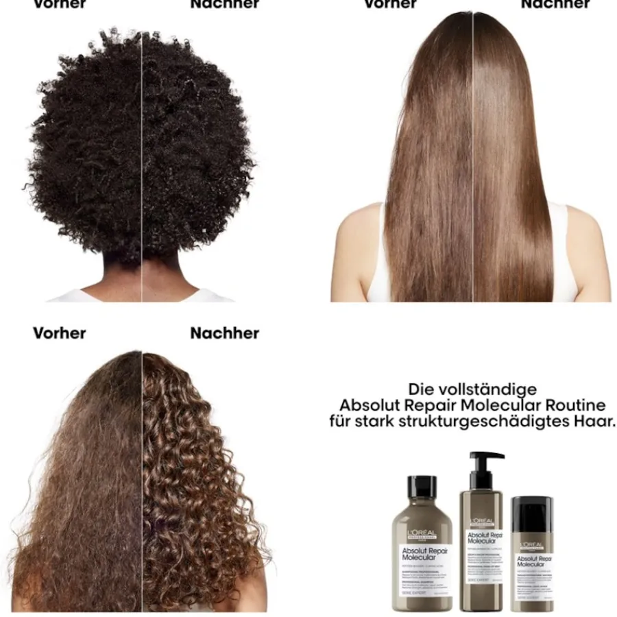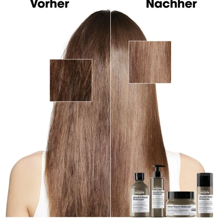 Dieses Shampoo zeichnet sich durch seine speziellen Inhaltsstoffe aus. Serie Expert Absolut Repair Molecular enthält Aminosäuren (Proteine) und aktive Substanzen (Peptide). Sie dringen tief in das Haar ein. Der Zustand wird bereits ab der ersten Anwendung deutlich verbessert. Die Wirkung ist für die Struktur revitalisierend. Sie wirkt sanfter und glanzvoller. Das Ergebnis ist eine um bis zu 86 % weichere Haarpracht. Bis zu 2 Jahre Vernachlässigung lassen sich mit nur einer Anwendung ungeschehen machen.L’Oréal Professionnel Paris empfiehlt dieses Produkt für eine normale Kopfhaut und alle Haartypen. Es spricht nichts gegen die Verwendung auf gefärbtem und meliertem Haar. Ein positiver Nebeneffekt der Haarpflege ist die verbesserte Kämmbarkeit. Das Shampoo wird in die feuchte Kopfhaut einmassiert. Dabei entsteht viel Schaum. Er wird mit warmem Wasser gründlich ausgespült. Sie können die Haarpflege in einer 300- oder 500-ml-Flasche kaufen.