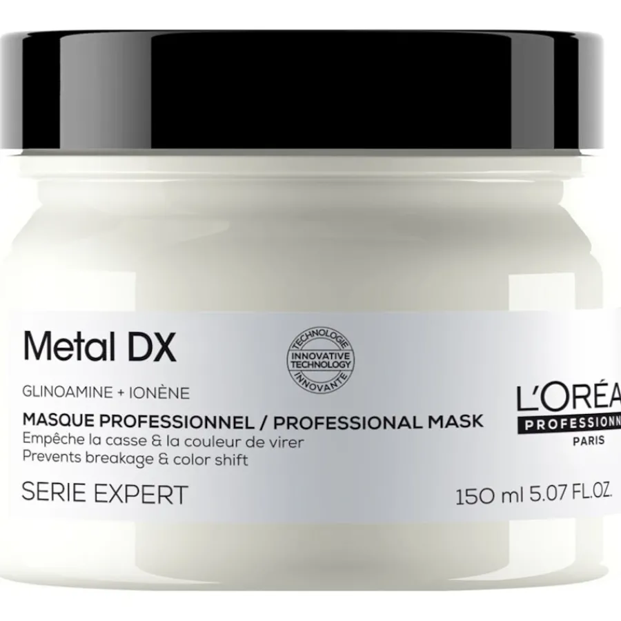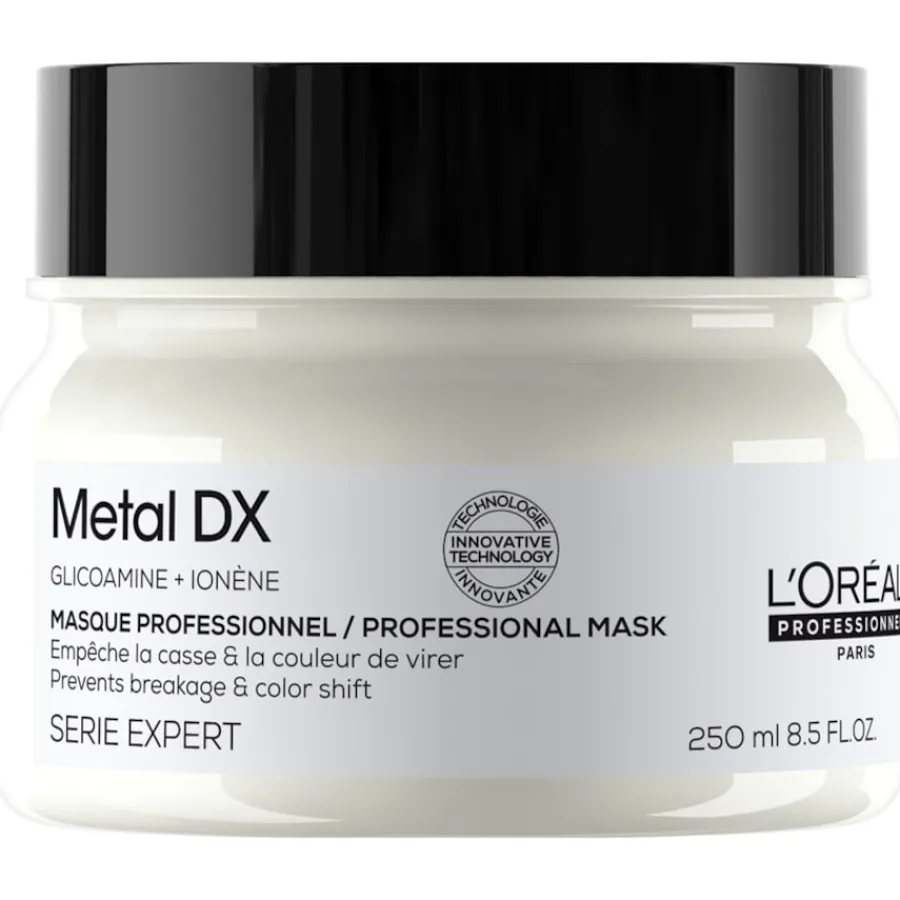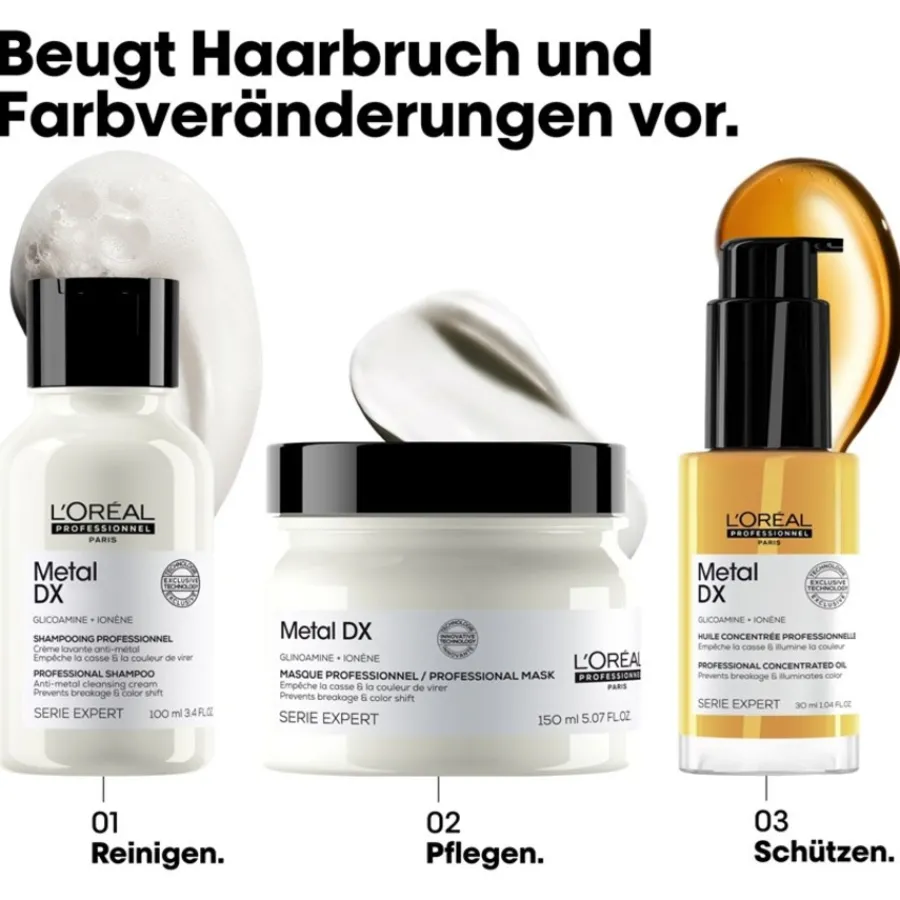 Erhalten Sie Glanz und Farbbrillanz Ihres blondierten oder colorierten Haars, indem Sie nach der Haarwäsche regelmäßig die Serie Expert Metal DX Professional Mask verwenden. Die Maske wirkt hydratisierend und versorgt Ihre Haare mit wertvollen Nährstoffen. Sie schließt die Farbpigmente im Inneren des Haars ein und sorgt für maximale Geschmeidigkeit und zartes, leicht frisierbares Haar. Tragen Sie die Maske nach der Haarwäsche mit einem L’Oréal Professionnel Shampoo auf das feuchte Haar auf und verteilen Sie sie gleichmäßig. Für optimale Haarpflege bis zu 15 Minuten einwirken lassen und danach gründlich auswaschen.