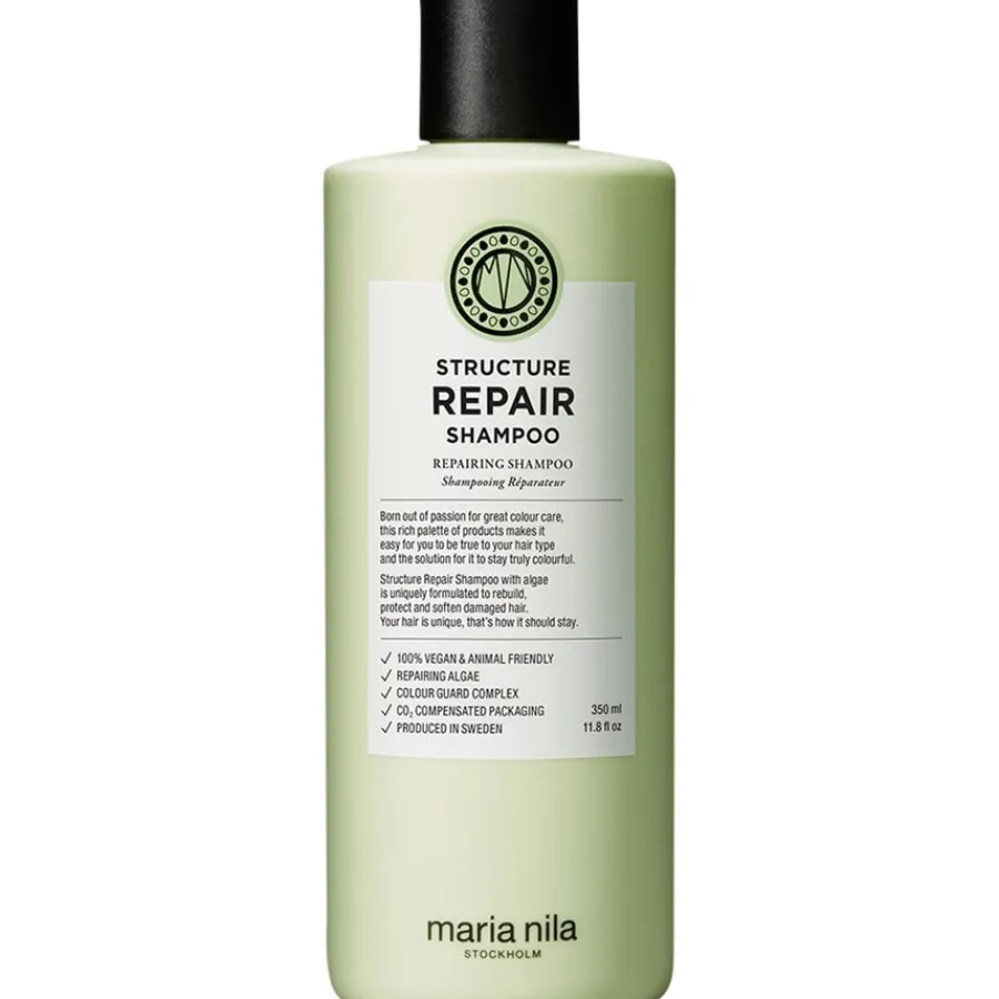 Das Structure Repair Shampoo von Maria Nila wurde speziell für trockene, kaputte und farbbehandelte Haare entwickelt. Die Formulierung mit Algenextrakt befreit das Haar ganz sanft von Verschmutzungen, spendet intensive Feuchtigkeit und stärkt gleichzeitig die Haarstruktur aus dem Inneren heraus. Das Haar wird dadurch wieder geschmeidig und sieht gesünder aus. Zusätzlich enthält das Shampoo einen Farbschutz-Komplex, der die Haarfarbe vor dem vorzeitigen Verblassen durch UV-Strahlen, freie Radikale, häufiges Haarewaschen und die Anwendung von Stylinggeräten schützt. Zum Wohl von Haar und Kopfhaut enthält die Aufbau & Reparatur Haarpflege weder tierische Inhaltsstoffe noch Sulfate und Parabene. Ohne reizende Zusatzstoffe und mit milden Waschsubstanzen ist die Haarpflege hervorragend für die tägliche Anwendung geeignet.Das Haarshampoo wird in das feuchte Haar einmassiert und nach einer kurzen Massage wieder ausgespült. Im Anschluss sollte das Haar mit dem Structure Repair Conditioner von Maria Nila gepflegt werden. Nur bei einer regelmäßigen Anwendung können optimale Ergebnisse erzielt werden.