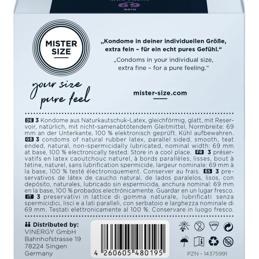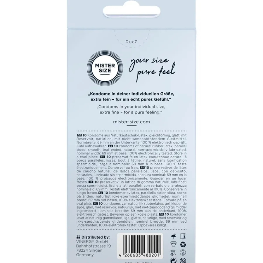 Wenn das Kondom nur schwer überziehbar ist und zu eng sitzt, kann Verhütung schnell zur Last werden. Deshalb orientiert sich MISTER SIZE stets an Ihrer persönlichen Penisgröße. Denn wenn Kondom und Penis perfekt harmonieren, wird der Sex endlich unbeschwert, natürlich und intensiv.Besondere Merkmale:-perfekte Passform – auch für große Dimensionen-sitzt fest, ohne zu drücken-extrem dünn mit nur 0,06 mm – für maximale Intensität-glatt und transparent-hergestellt aus NaturkautschuklatexZertifizierte QualitätDie Marke für Kondome MISTER SIZE sorgt für ein völlig neues Empfinden beim Sex und gewährleistet gleichzeitig optimale Sicherheit. Nur so können Sie sich beim Liebesspiel vollkommen entspannen. Daher erfüllen alle Kondome von MISTER SIZE die Anforderungen und werden sorgfältig geprüft.