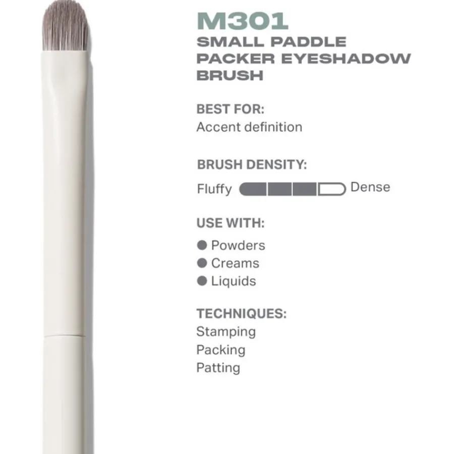 Geeignet ist der M301 Small Paddle Packer Eyeshadow Brush vor allem für flüssiges Make-up, aber auch für cremige und puderförmige Kosmetika. Dank des schlanken und langen Griffs kann beim Auftrag mit dem Winkel der Bürste gespielt werden, um den Druck zu variieren und so verschiedene Effekte mit diesem Augenpinsel zu erzielen.