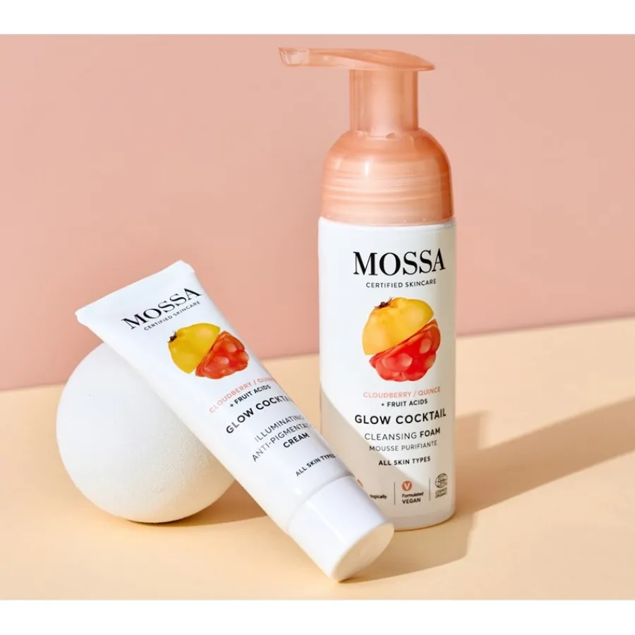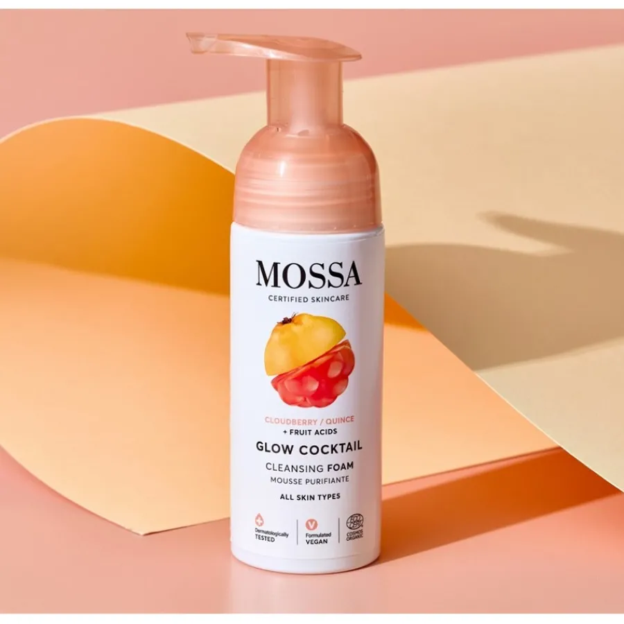 Mithilfe des GLOW COCKTAIL Cleansing Foam der Kosmetikmarke Mossa ist eine porentiefe Reinigung aller Hauttypen problemlos möglich. Die pflegenden Inhaltsstoffe sorgen für einen strahlenden Teint. Vitamine und Antioxidantien aus der Moltebeere lassen die Gesichtshaut frischer und ebenmäßiger erscheinen. Die reichhaltigen Nordhyazinthen- und Quittenextrakte sorgen zusätzlich für eine umfangreiche Hautpflege. Der vegane Cleansing Foam kann somit morgens und abends angewendet werden. Um das bestmögliche Ergebnis erzielen zu können, sollte der Schaum in kreisenden Bewegungen auf die angefeuchtete Haut aufgetragen werden. Im Anschluss lässt er sich mit warmem Wasser gründlich abspülen.