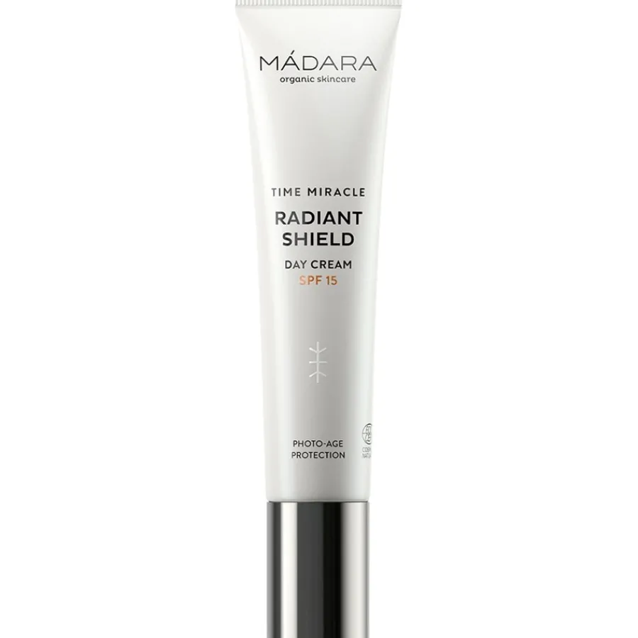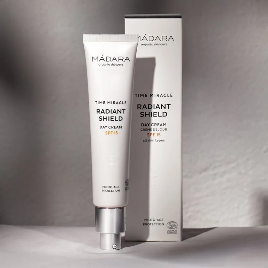 Die leichte Formulierung der Hautpflege von MÁDARA schenkt der Haut einen schönen Glow! Sie können die Radiant Shield Day Cream SPF15 bei allen Hauttypen und auch bei reiferer Haut verwenden. In der Pflege sind insgesamt 99 % der Zutaten aus natürlichem und 41 % aus biologischem Ursprung.