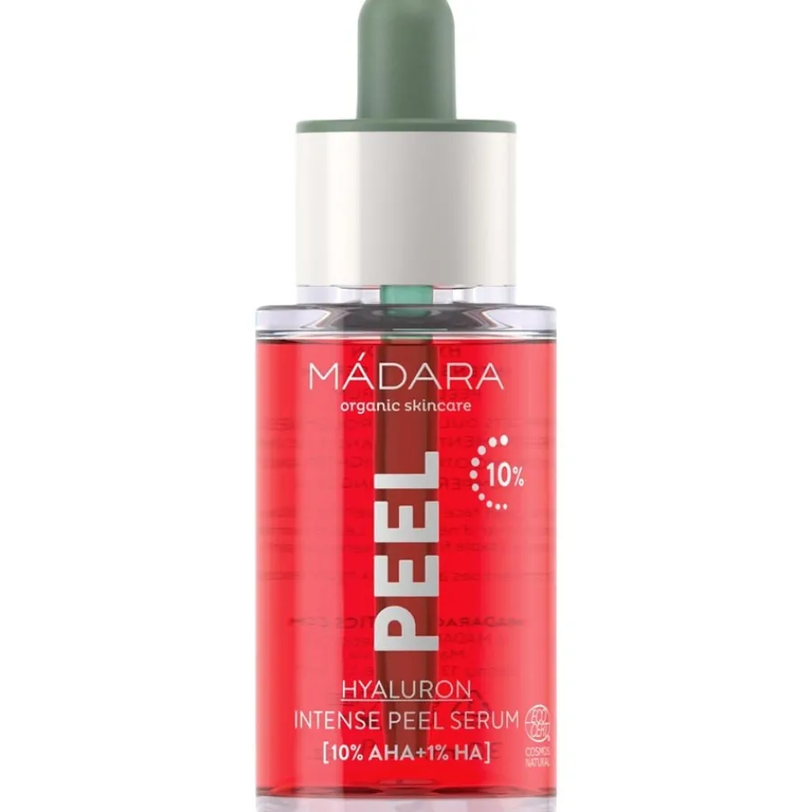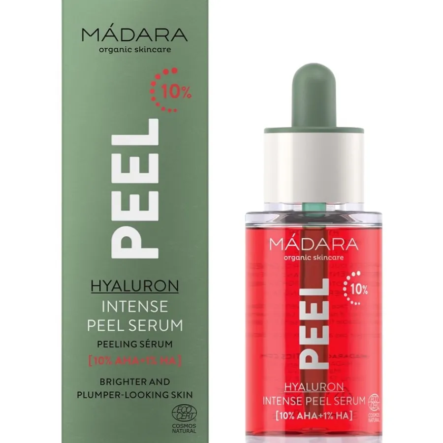 Das Peel Hyaloron Intense Peel Serum von MÁDARA hydratisiert die Haut tiefenwirksam und bewahrt sie vor dem Austrocknen. Es peelt die Haut schonend, hellt sie auf und hinterlässt ein gleichmäßiges Hautbild. Anzeichen der Hautalterung wirkt es sichtbar entgegen. Es reduziert das Erscheinungsbild feiner Linien und glättet die Haut. Wenden Sie das Serum ein- bis zweimal wöchentlich an. Massieren Sie es abends in die gereinigte Haut ein und lassen Sie es über Nacht einwirken. Am Morgen können Sie sich über seidig glatte, pralle Haut und einen ebenmäßig strahlenden Teint freuen!