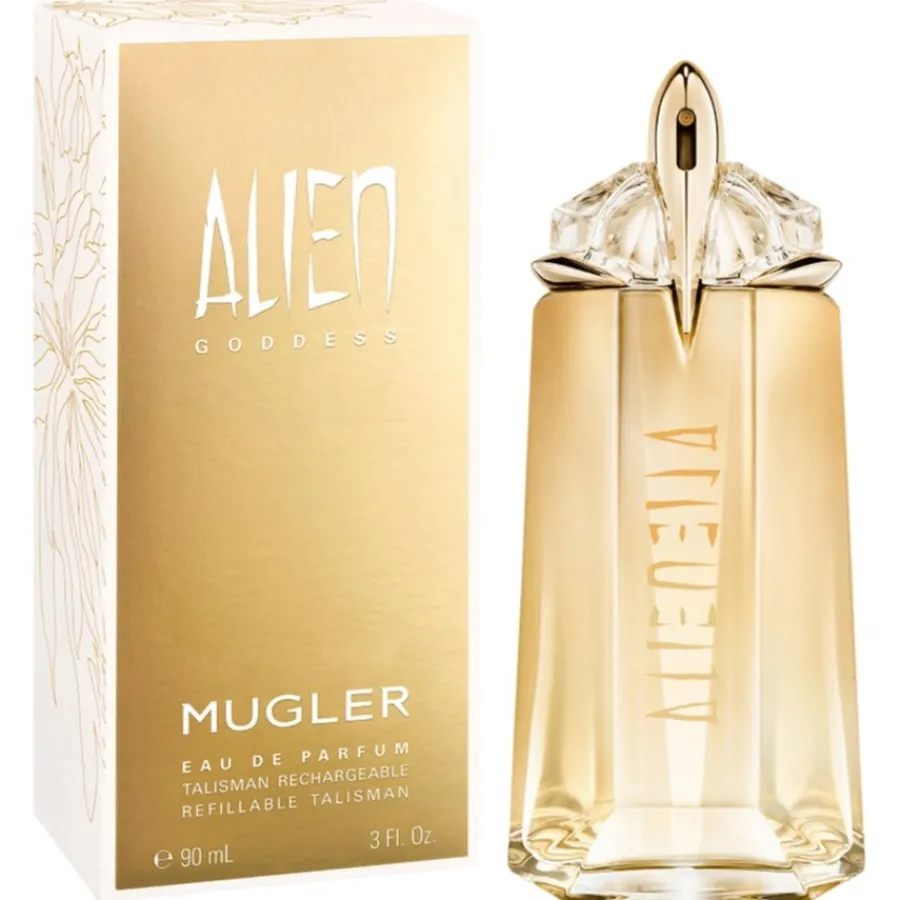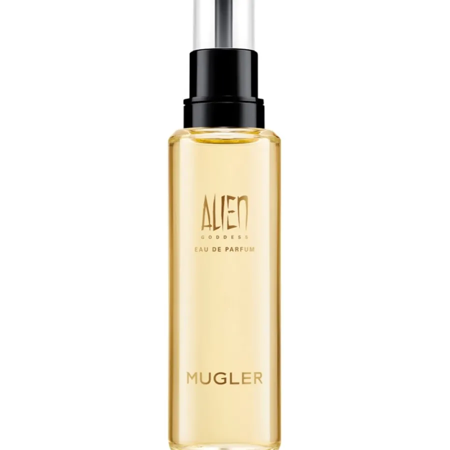 Der Flakon erinnert mit seinen goldenen Elementen und der metallisch glänzenden Oberfläche an einen Talisman. Darüber hinaus ist das Alien Goddess Eau de Parfum von MUGLER ganz im Sinne der Nachhaltigkeit auch im Nachfüllflakon erhältlich.