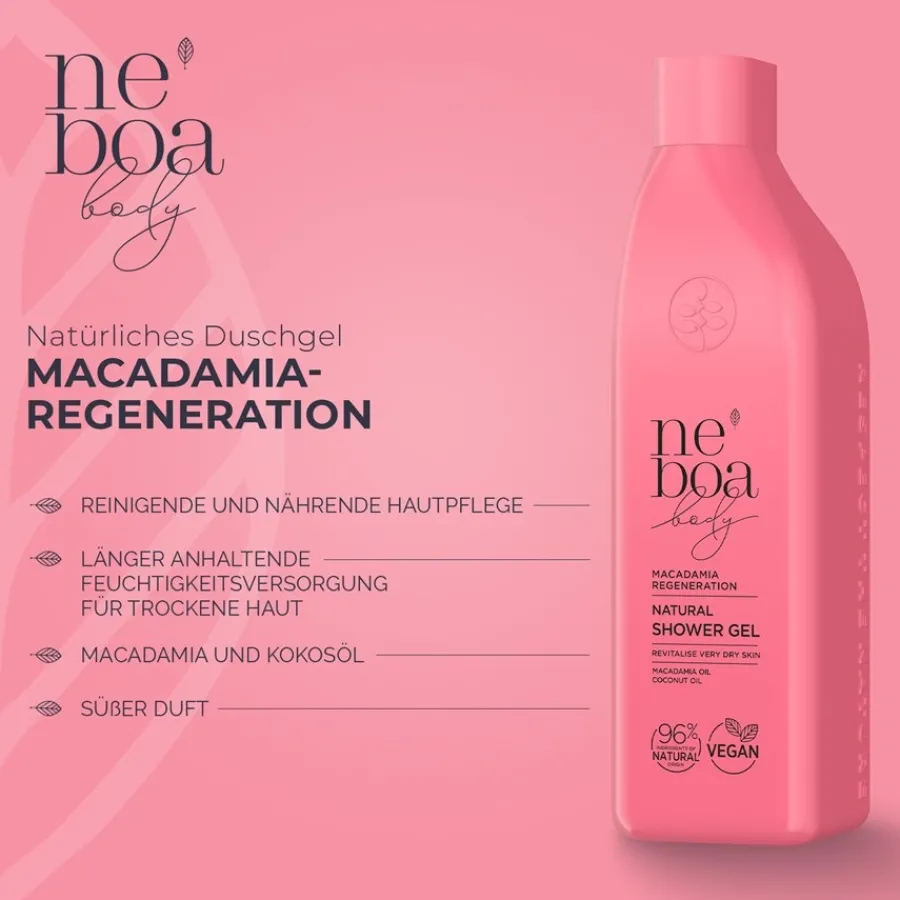 Die Wirkweise vom Neboa Duschgel ist beeindruckend. Es bietet eine reinigende sowie nährende Hautpflege, stärkt und regeneriert die Haut, verleiht Geschmeidigkeit in Verbindung mit Elastizität. Darüber hinaus sorgt die Macadamia Regeneration für eine lang anhaltende Versorgung mit Feuchtigkeit – wichtig zum Beispiel für die trockene Haut. Das Neboa Macadamia Shower Gel reinigt in sanfter Weise und besitzt intensive Pflegeeigenschaften. Macadamia und Kokosöl wirken belebend und erfrischend. Ein angenehm süßer Duft verbreitet sich mit der Anwendung vom Neboa Shower Gel. Das Kokosnussöl nährt die Haut und verleiht Spannkraft. Die Elastizität wird verbessert. Hochwertige Inhaltsstoffe auf veganer Basis, einfache Anwendung und regenerierende Eigenschaften – ein Hautpflege-Produkt der besonderen Art.