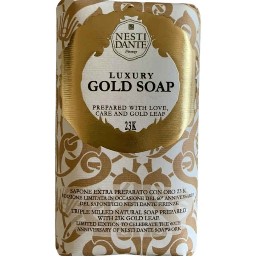 Zur Feier des 60-jährigen Bestehens der Seifenproduktion wurde eine natürliche Seife erstellt, die mit 24 Karat Blattgold versehen ist. Gold ist ein edles Material, das bereits seit Tausenden von Jahren als Element der Energie und Langlebigkeit gilt. Gold steht für eine reiche Kultur und starke Tradition. Mit der Essenz von Iris, dem Symbol der italienischen Stadt Florenz, wurde die Ausstrahlung des Edelmetalls verfeinert und mit einem starken Duft umgeben. Das Gel verwandelt sich in Sekundenschnelle in einen aufbrausenden Schaum, der sich wie ein sanfter Teppich schonend um die Haut legt und diese sanft von Verunreinigungen befreit.