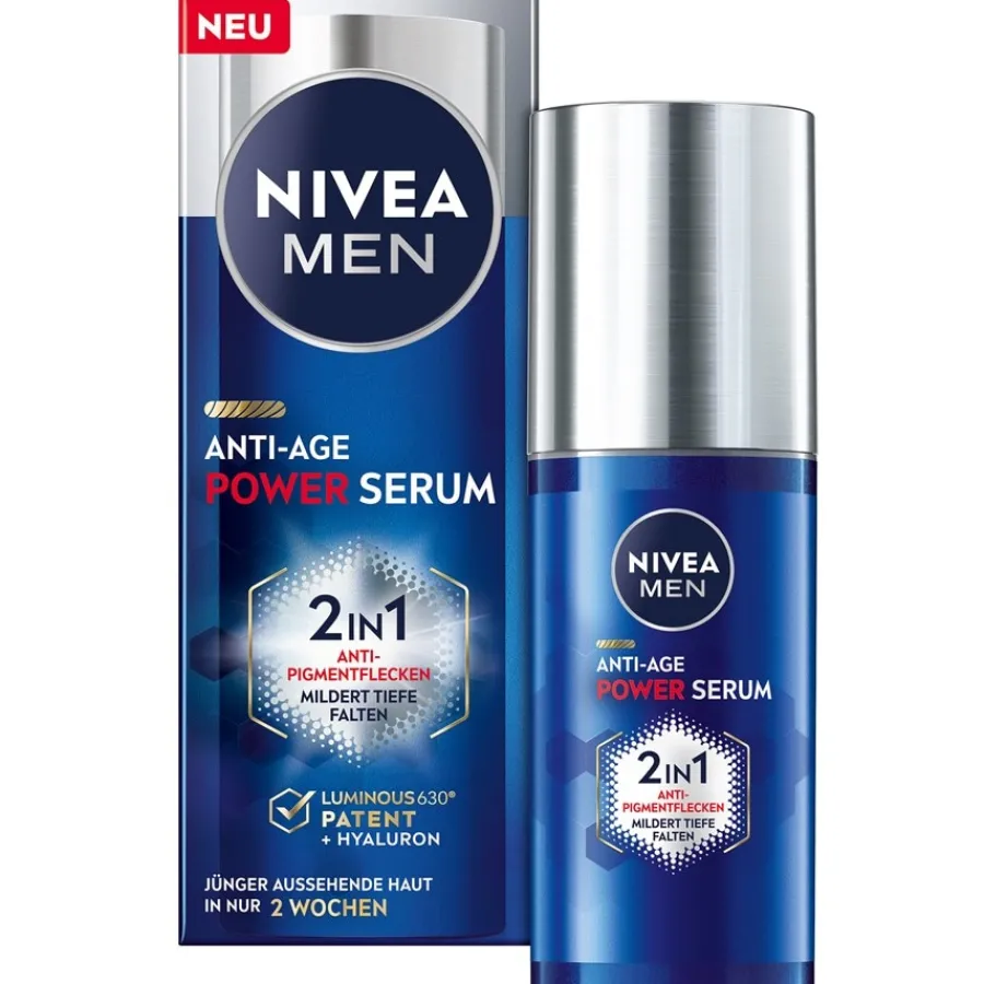 Das NIVEA Gesichtspflege Anti-Age 2in1 Power Serum charakterisiert eine leichte, fast schon schwerelose Rezeptur, wodurch die leichte Pflege schnell und ohne störende Rückstände zu hinterlassen in die Haut einzieht. Hyaluronsäure füllt die Feuchtigkeitsspeicher der Haut auf, zudem ist Hyaluron für das Aufpolstern der Falten verantwortlich. Der Hersteller selbst gibt an, dass Männer bereits nach zwei Wochen der kontinuierlichen Anwendung erste sichtbare Ergebnisse erwarten dürfen – in Form einer revitalisierten, jünger wirkenden Haut. Unreinheiten beugt das Serum ebenfalls vor, um für einen gleichmäßigen Teint zu sorgen.
