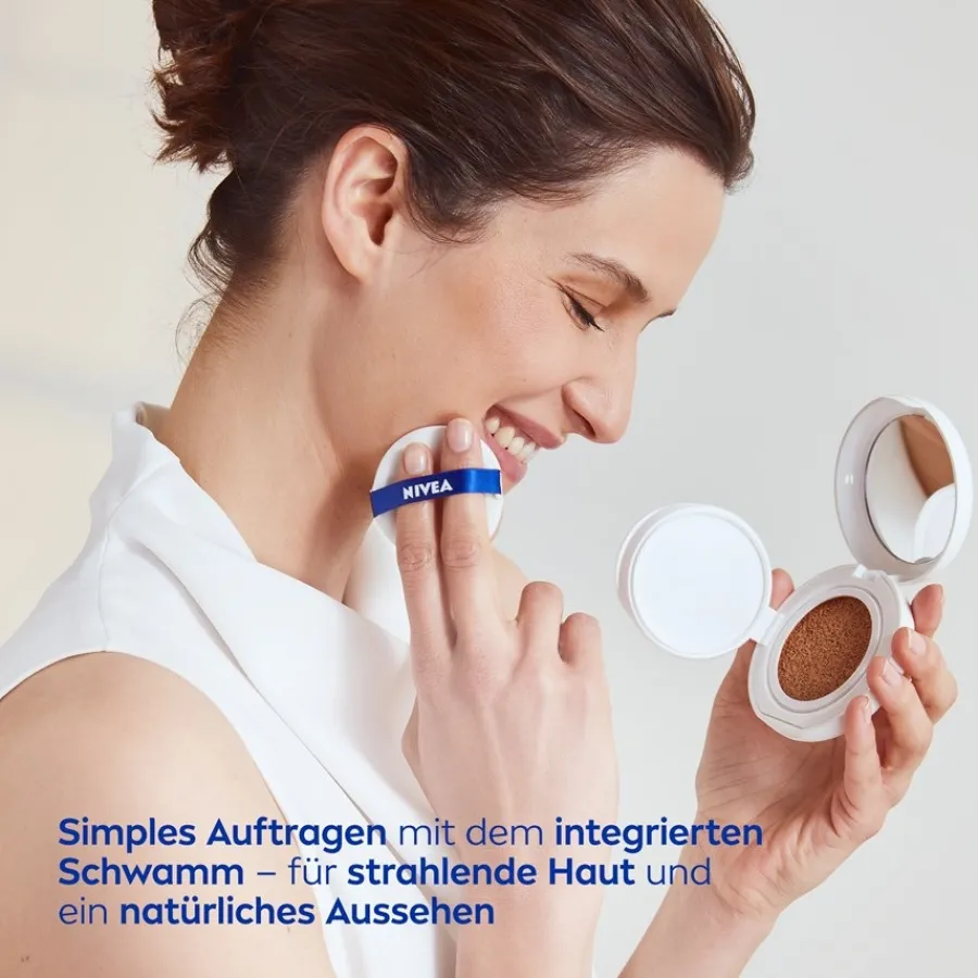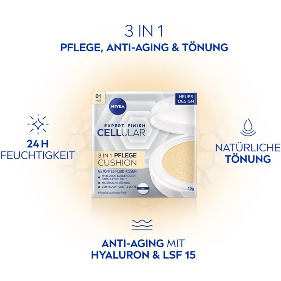 Das innovative Hyaluron Cellular Expert Finish 3in1 Pflege Cushion von NIVEA unterstützt eine jugendliche, strahlende Haut und ein natürliches Aussehen. Dieses einzigartige Pflegekissen bietet sichtbare Ergebnisse, die langfristig wirken. Es ist einfacher und pflegender als ein herkömmliches Make-up und verleiht der Haut ein ebenmäßiges und jugendliches Strahlen. Feine Fältchen werden gemildert. Die innovative 3-in-1-Formel ist mit hochwirksamer Hyaluronsäure angereichert und aktiviert die Hautzellen, ihre eigene Hyaluronsäure zu produzieren. Durch deren Fähigkeit, große Mengen Wasser zu binden, wird die Haut 24 Stunden mit Feuchtigkeit versorgt. Sie wird durch die Hautpflege gestrafft, erhält einen frischen Teint und fühlt sich weich und sanft an.