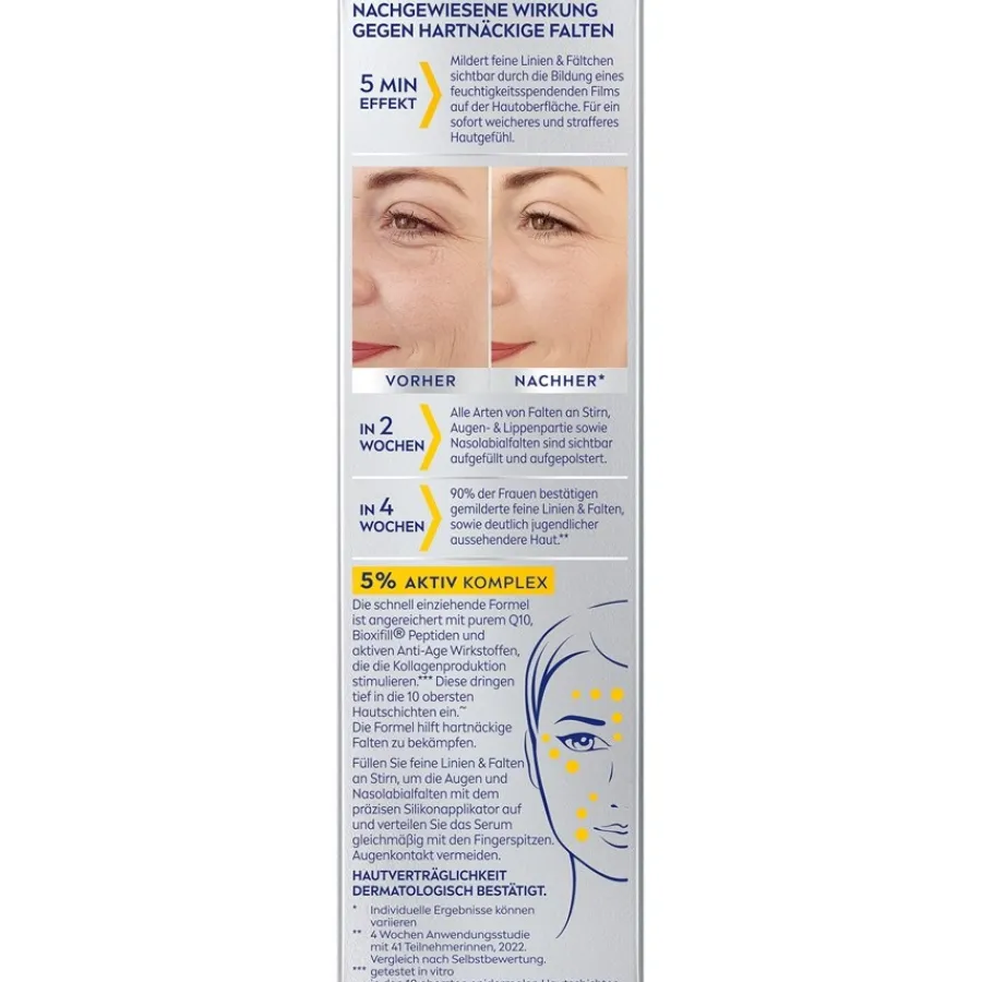 Fältchen und Linien graben sich vorrangig an der Stirn, der Augen- und Lippenpartie und im Nasolabialbereich zwischen Nasenflügel und Mundwinkel ein. Cremen Sie diese Stellen mit dem NIVEA Auffüller ein – und bereits nach fünf Minuten setzt ein Effekt der Aufpolsterung und Glättung ein. Zudem verwöhnt die Hautpflege mit einem angenehmen Duft.Das Produkt Gezielter Falten-Auffüller erfreut bei regelmäßiger Anwendung mit einer erstaunlichen Langzeitwirkung. Es setzt dabei auf das Coenzym Q10. Dieses hilft der Haut zu regenerieren, sich mit neuer Energie zu versorgen, gesund und jung zu bleiben. Weiter enthält das NIVEA Serum und Kur Produkt Peptide, die straffend und feuchtigkeitsspendend wirken.