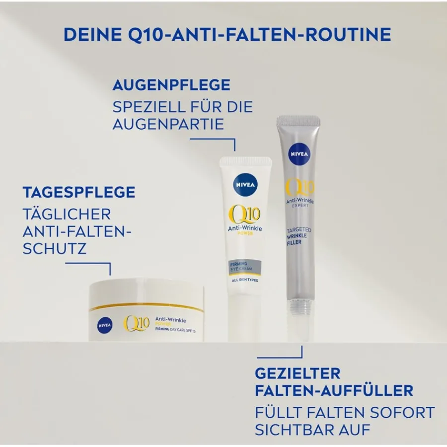 3.) Optimale Resultate: Täglich nach der Anwendung der Q10 Straffenden Tagespflege und vor dem Auftragen von Make-up anwenden.