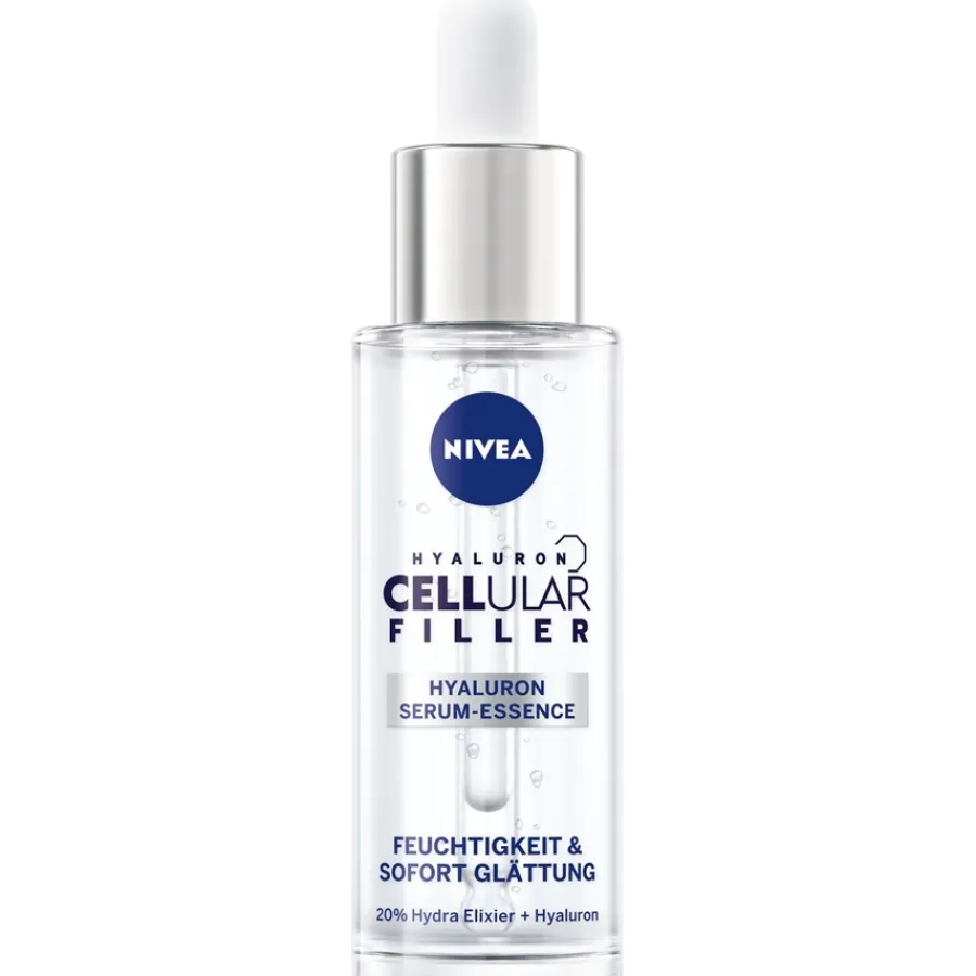 Die Hyaluron Cellular Filler Hyaluron Serum-Essence von NIVEA pflegt die Haut intensiv, regeneriert den hauteigenen Feuchtigkeitsgehalt und glättet die Hautoberfläche. Die Serum-Kur eignet sich hervorragend zur Anti-Aging-Pflege. Als erster Schritt der täglichen Hautpflege wird die Essenz mit ultra-leichter Textur morgens und abends nach der Gesichtsreinigung mit der Pipette aufgetragen. Die Anwendung dauert nur 20 Sekunden. Anschließend wird die Tages- oder Nachtcreme sanft auf der Haut verteilt.