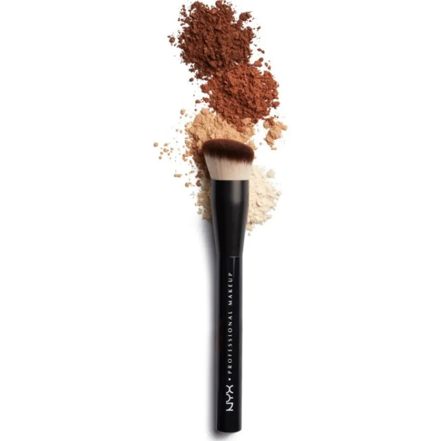 Mit dem Foundationpinsel Can’t Stop Won’t Stop von NYX Professional Makeup gelingt das Auftragen von flüssiger Make-up-Foundation auch Anfängern spielend leicht. Das hier angebotene Pinselmodell hat die leicht angeschrägt facettierten Borsten fest im Griff und erlaubt eine äußerst präzise Applikation auf Wangen, Stirn, Kinn und Nasenrücken. Dank der speziellen Anordnung der Pinselborsten gelangt das Make-up-Tool ohne Probleme auch an schwer zugängliche Hautpartien, ohne beim Finish des Make-ups an Qualität einzubüßen. Striemen, wie sie bei flüssiger Foundation mitunter ein Thema sein können, sind bei der Anwendung des NYX Professional Makeup Pinsels nicht zu erwarten. Mit dem Foundationpinsel Can’t Stop Won’t Stop können Sie die Übergänge Ihres Make-ups easy verblenden.