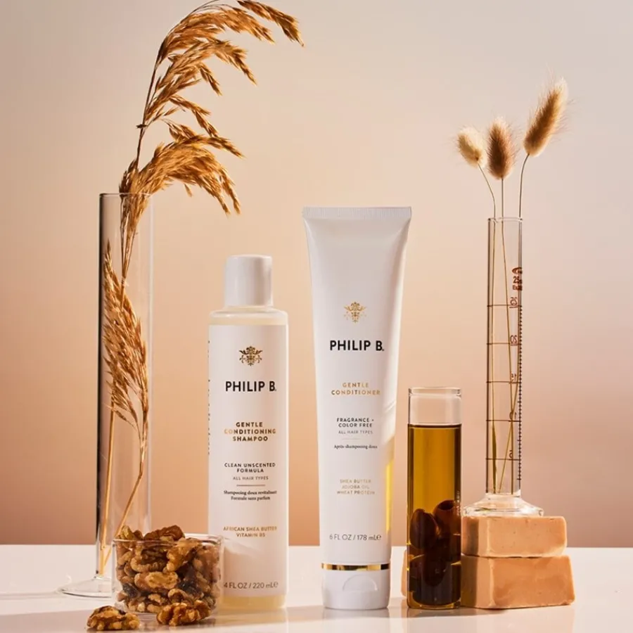 Während die Tube voll und ganz auf ein schlichtes und zurückhaltendes Design setzt, können sich die Inhaltsstoffe vom Philip B Gentle Conditioner Fragrance + Color Free durchaus sehen lassen. Angereichert wurde der Conditioner unter anderem mit Vitamin B5, Weizenproteinen und Sheabutter. Letztere ist eine Konstante in der Welt der Haarpflege, allen voran dank der feuchtigkeitsspendenden und nährenden Wirkung. Weizenproteine sorgen indes für ein seidiges und sehr weiches Haargefühl, während Vitamin B5 die natürlichen Abwehrkräfte der Haarfasern stärkt und damit proaktiv Spliss entgegenwirken kann. Ätherische Öle aus der Zitrone und Orange sind ebenso enthalten.