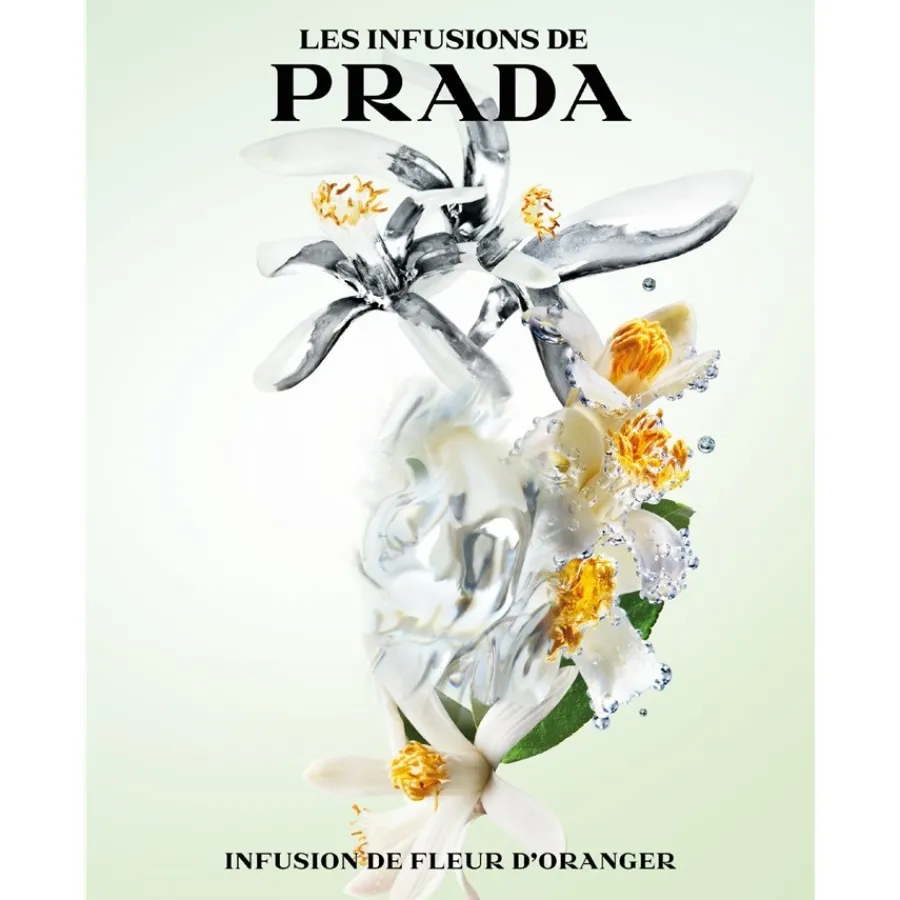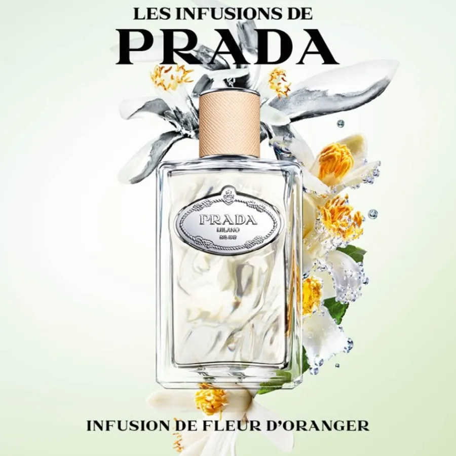 Der Duft Infusion Fleur d’Oranger beginnt mit der Kopfnote, die eine Komposition aus unterschiedlichen Orangennuancen präsentiert. Tunesische und marokkanische Orangenblüten treffen auf Neroli, Mandarine und Orange Blossom Absolue. Das Eau de Parfum Spray von Prada beherbergt in seiner Herznote die Süße der indischen Tuberose, während die Basisnote von der Noblesse des indischen Jasmin-Sambacs bestimmt wird. Der Flakon, in dem sich das Eau de Parfum Spray Infusion Fleur d’Oranger befindet, ist mit seiner rechteckigen Form, gemildert durch abgerundete Kanten, und dem orange-gelb abschattierten Verschluss ein Blickfang für jeden Schminktisch. Auf seiner Vorderseite ist das silberne Wappen-Logo von Prada in eleganter Metalloptik angebracht, das sich auch auf dem stilvollen Verpackungskarton des Parfums wiederholt. Dieser wurde nach einem Druck im Art Déco-Stil aus dem Prada-Textilarchiv gestaltet. Auf dunklem Untergrund winden sich grüne Zweige, Orangen und weiß-rosa Orangenblüten, die stilisiert auf den charmanten Duft hinweisen.