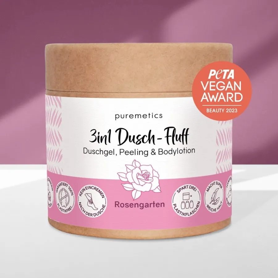 Peelings werden meist in selteneren Abständen empfohlen, damit die Haut nicht geschädigt wird. Mit 3in1 Dusch Fluffs sind Sie auf der sicheren Seite, denn Zuckerpeeling mit feinsten Zuckerpartikeln ist natürlich und für die Haut völlig unschädlich. Das Duschgel können Sie bedenkenlos täglich verwenden. Der Hersteller puremetics achtet auch auf weitere gesunde Inhaltsstoffe. Das Duschgel enthält natürliche Wirkstoffe, zum Beispiel Kokosöl und pflanzliches Glycerin. Somit ist die Dusch- und Hautpflege auch für sensible Haut sehr gut geeignet. Das Duschgel mit gleichzeitigem Peeling-Effekt und der Pflegewirkung einer ausgezeichneten Bodylotion ist vegan und ohne Mikroplastik.