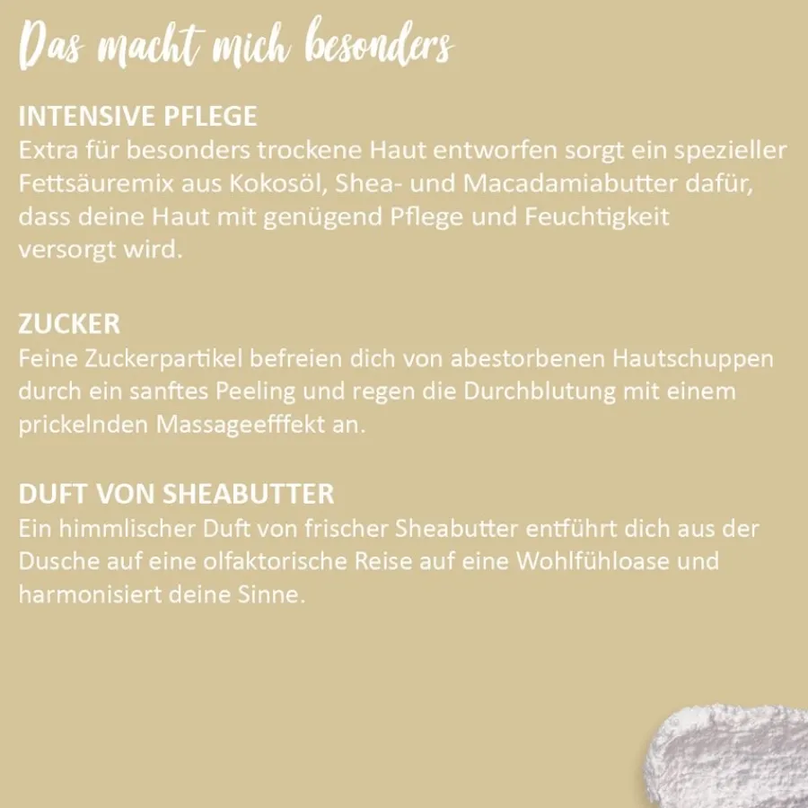 Peeling, Duschgel und pflegende Lotion: Das klingt nach einer kompletten Hautpflegeroutine. Zwei wichtige Inhaltsstoffe im Dusch-Fluff sind Sheabutter und Macadamianussbutter. Sie geben ihm nicht nur einen köstlich nussigen Duft. Sie sind auch verantwortlich für seinen intensiven Pflegeeffekt. Beide spenden Feuchtigkeit und schützen die Haut vor Umwelteinflüssen. Außerdem enthält die Formel pflegendes Kokosöl und feuchtigkeitsspendendes Glycerin.