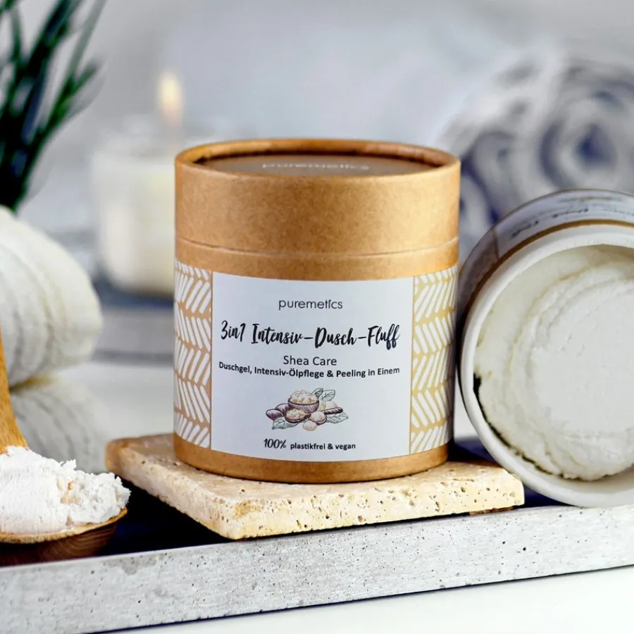 Der Shea Care 3in1 Intensiv-Dusch-Fluff ist eine tolle Entwicklung von puremetics. Duschgel, Peeling, Körperlotion: All diese Aufgaben kann das innovative Produkt für die Hautpflege erfüllen. Das Unternehmen hat sich auf nachhaltige Kosmetik spezialisiert. Deswegen ist das Sortiment plastikfrei. Gleichzeitig entwickelt das Team von puremetics wirksame Hautpflegeprodukte, die ohne bedenkliche Inhaltsstoffe auskommen.