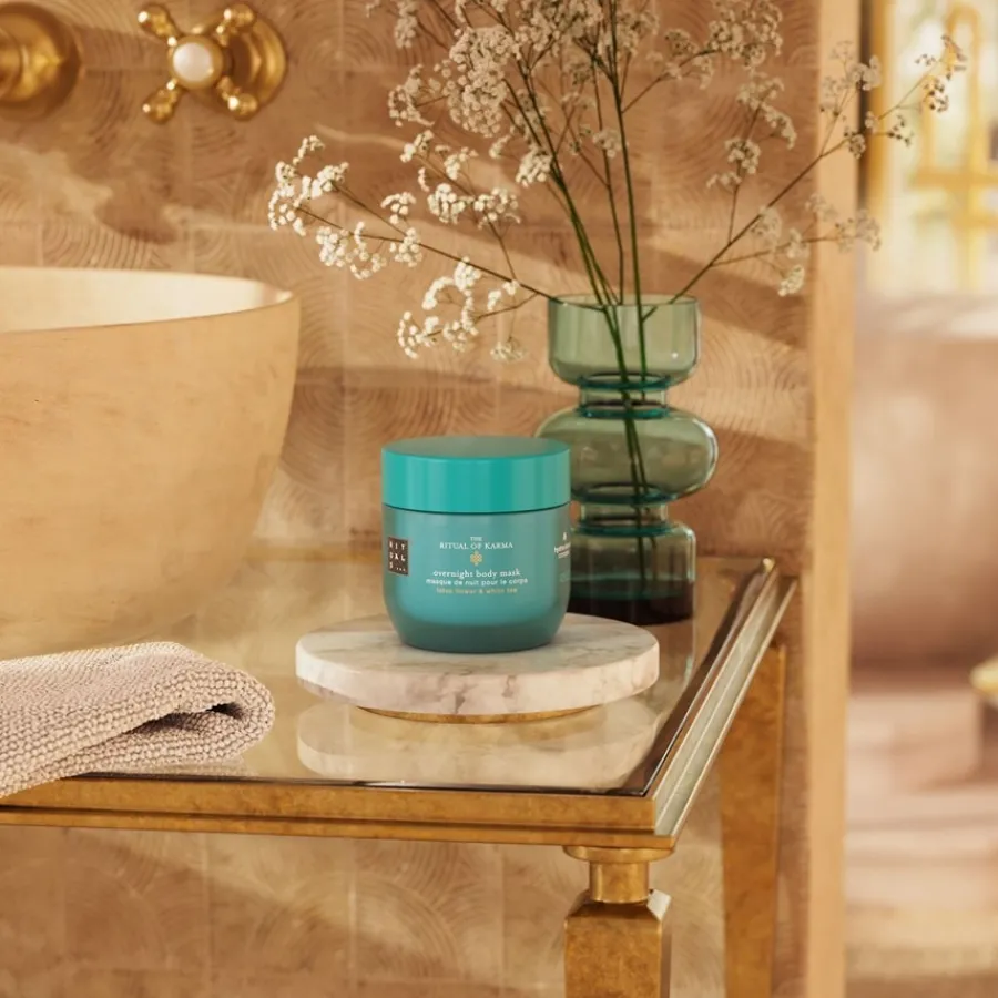 Mit der RITUALS The Ritual Of Karma Overnight Body Mask können wir zwar kein gutes Karma, aber eine hocheffiziente und wohltuende Hautpflege garantieren. Die Körpermaske verwöhnt Ihre Haut während Sie schlafen, damit Sie diese am Morgen wiederum in vollen Zügen genießen können. Dank der leichten Gelformulierung lässt sich die Hautpflege sehr leicht verteilen, zudem zieht die RITUALS The Ritual Of Karma Overnight Body Mask direkt in die Haut ein – so wird sie auch nicht zur Gefahr für Bettlaken und Bettwäsche. Bereits nach der ersten Anwendung dürfen Sie sich laut Herstellerangaben über eine samtweiche und streichelzarte Haut freuen.