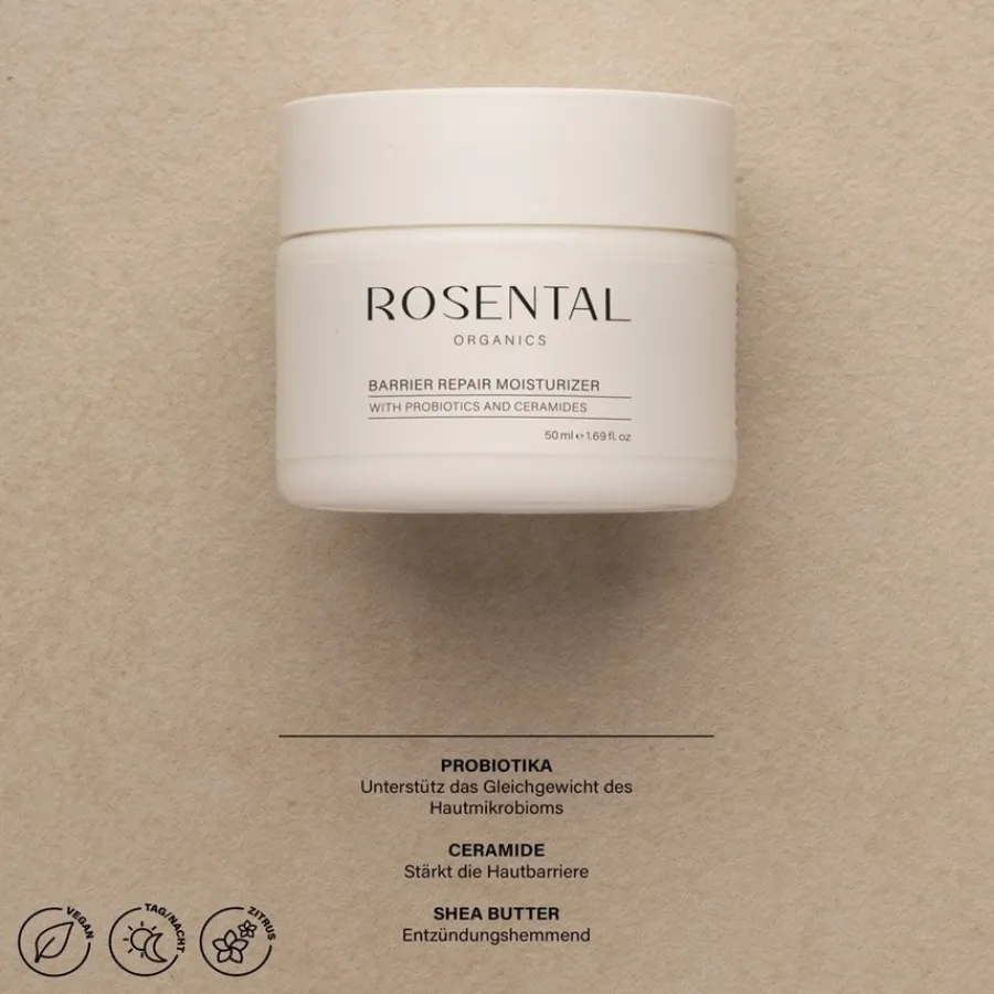 Die Hautpflege enthält Ceramide und Probiotika, die Rötungen und Reizungen entgegenwirken und Unreinheiten mindern. Sheabutter versorgt die Haut indes mit wertvoller Feuchtigkeit, glättet und kurbelt die Regeneration an. Das Hautbild wird ausgeglichen, was Sie bei regelmäßiger Anwendung des Barrier Repair Moisturizers nicht nur sehen, sondern auch fühlen können. Die Feuchtigkeitspflege ist entzündungshemmend und so sanft zur Haut, dass sie auch für sensible Hauttypen gut geeignet ist. Einfach eine haselnussgroße Menge des Moisturizers auf Gesicht und Hals auftragen und sanft einmassieren. Ist Ihre Haut sehr feuchtigkeitsbedürftig, empfiehlt sich vorab die Anwendung eines Serums – am besten ebenfalls aus dem Hause Rosental Organics.