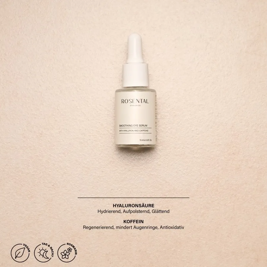 Das Smoothing Eye Serum ist eine wertvolle Gesichtspflege von Rosental Organics. Diese glättende Augenpflege überzeugt mit einem Duo-Boost-Effekt: Aufpolsternd wirkendes Koffein und Hyaluron sorgen für Glätte Ihrer feinen Haut unter den Augen und unschöne Augenringe schwellen ab.