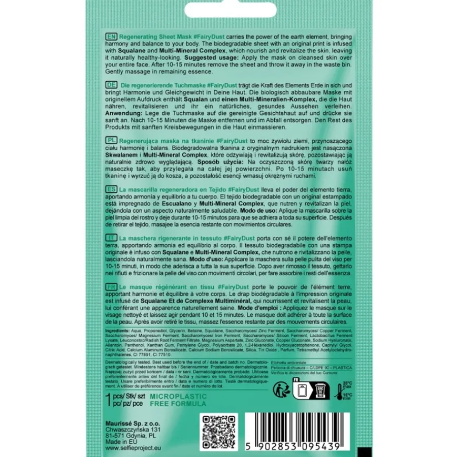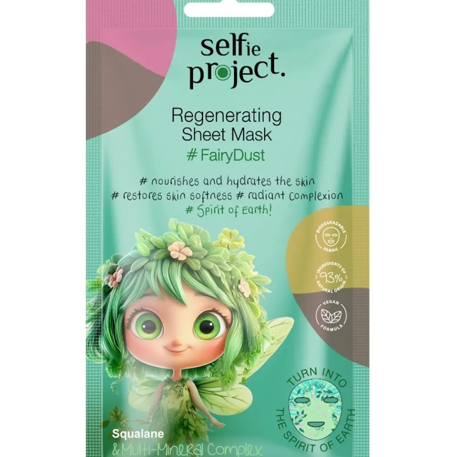 Die Selfie Project Fantasy Regenerating Sheet Mask #FairyDust spiegelt die Kraft des Elements Erde wider. Sie besteht aus einem weichen, biologisch abbaubaren Material, das sich angenehm auf der Haut anfühlt und sich zudem perfekt an die Gesichtskonturen anpasst. Die Wirkstoffe können dadurch noch besser in die Haut eindringen. Getränkt ist die Tuchmasken-Hautpflege in einem Serum mit Squalan und einem Multi-Mineralien-Komplex. Die Inhaltsstoffe nähren und revitalisieren die Haut und bringen sie wieder ins Gleichgewicht. Ihr Teint wirkt dadurch innerhalb weniger Minuten frischer und gesünder. Die Tuchmaske ist jedoch nicht nur durch ihre Wirkung ein Hit, mit dem originellen Druck macht die Beautybehandlung zudem jede Menge Spaß.